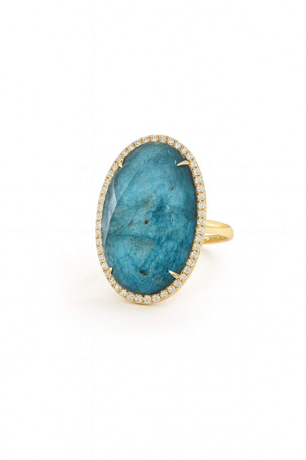 Inspired by the serene depths of the Mediterranean, The Aegean Halo Ring captures the allure of tranquil blue waters and golden sunlight. A magnificent oval-cut blue gemstone rests at its center, framed by a delicate halo of shimmering diamonds set in warm 18kt yellow gold. The stone’s natural inclusions dance with character and light, evoking the mystery of the sea. A statement of grace and sophistication, this ring is both timeless and effortlessly modern.