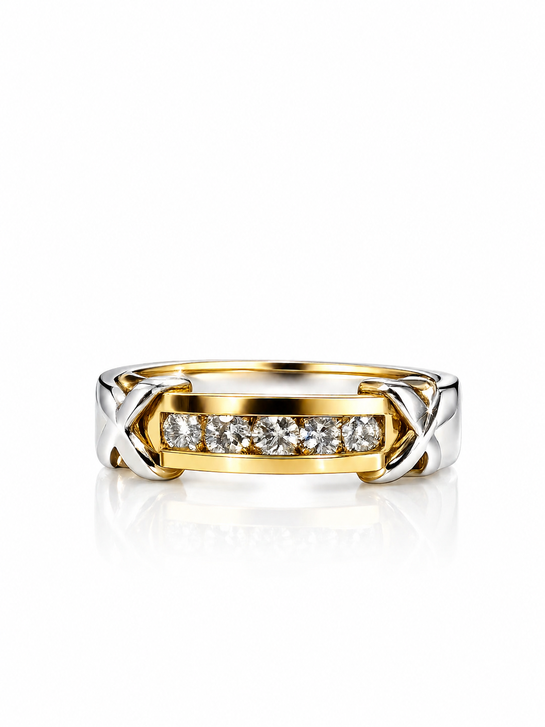 Refined elegance meets modern design in The Aurelia Criss-Cross Diamond Band—a striking two-tone gold ring crafted for timeless sophistication. Featuring a seamless fusion of luminous yellow gold and polished white gold, this distinctive band showcases an elegant criss-cross motif that symbolizes unity and enduring connection. At its center, a row of brilliant round-cut diamonds is expertly set to maximize sparkle, catching the light with every movement.