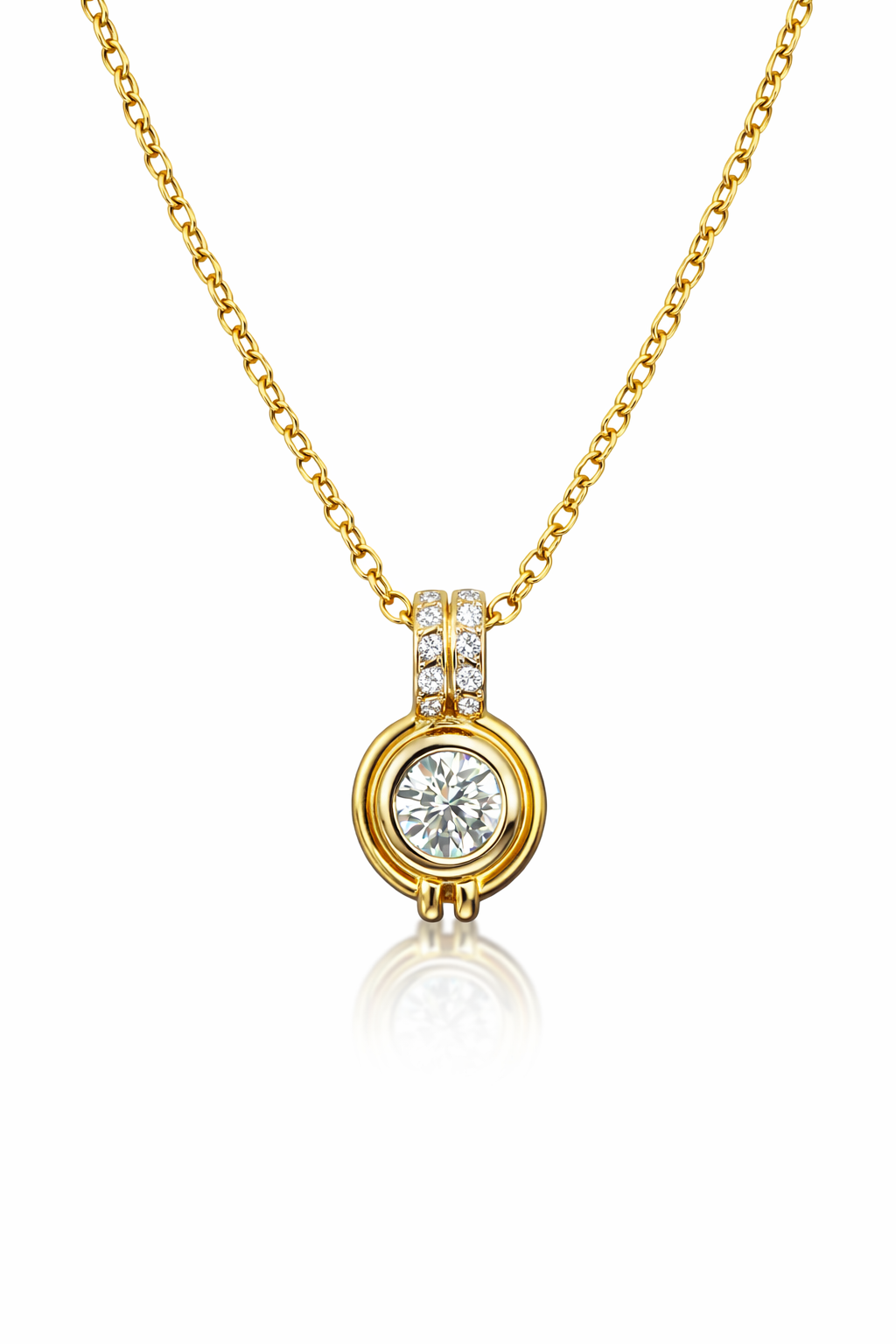 Illuminate every moment with the Aurelia Diamond Medallion Pendant, a radiant fusion of classic craftsmanship and modern luxury. This custom-designed piece features a brilliant round diamond bezel-set in warm yellow gold, framed by shimmering diamond accents along the bail for added sophistication. Suspended from a rich, high-polish gold chain, it offers an effortlessly elegant look that transitions seamlessly from day to evening.