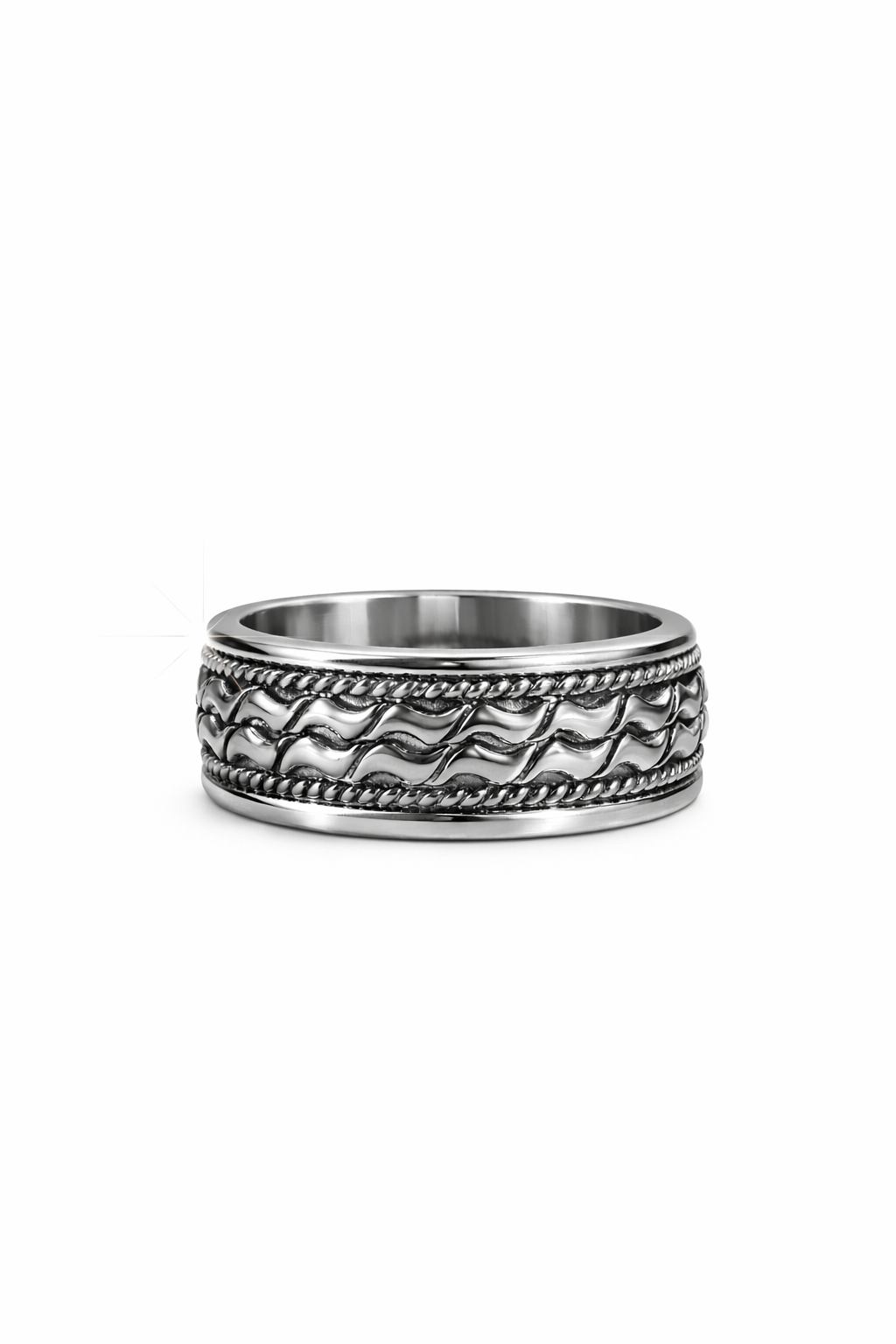 This intricately sculpted band features a continuous woven braid motif framed by polished rope edges, symbolizing unity, eternity, and enduring commitment. The high-polish interior ensures exceptional comfort, while the dimensional detailing adds depth and character from every angle. Designed with substantial presence yet effortless wearability, this band transitions seamlessly from formal elegance to everyday distinction.