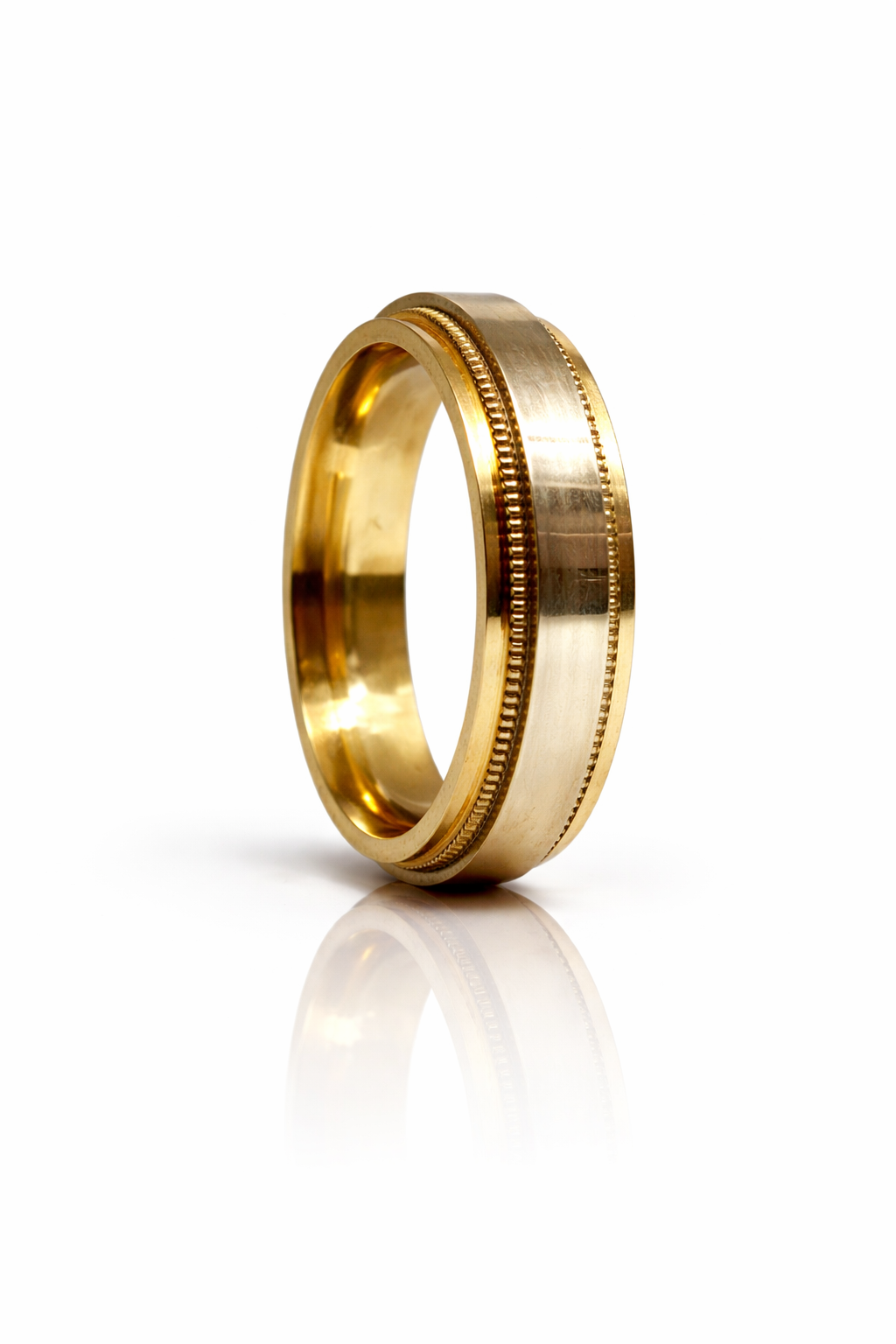Men’s yellow gold drop edge milgrain wedding band with brushed center finish and polished edges. A luxury comfort-fit men’s wedding ring combining modern design with classic milgrain detailing—ideal for timeless, elegant style.