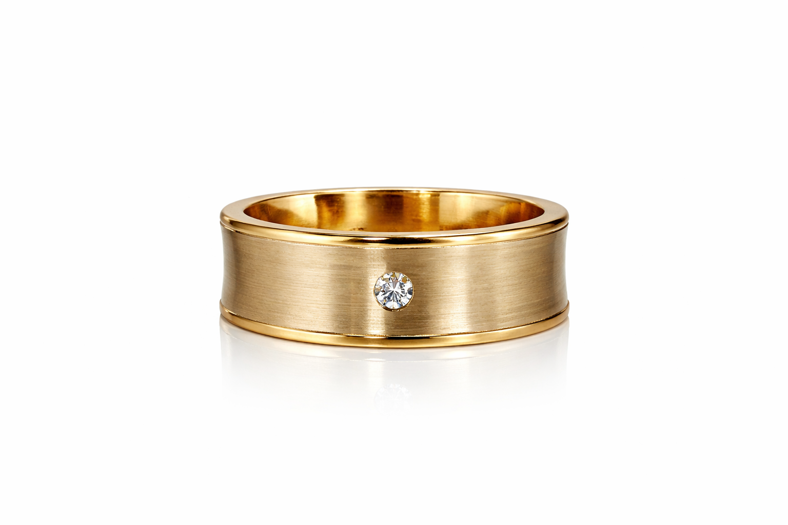 Refined strength meets modern luxury in The Aurelius Diamond Band — a distinguished men’s wedding band crafted in rich yellow gold. Featuring a sleek brushed finish with polished edges, this design is elevated by a single round brilliant-cut diamond, precision-set for a subtle yet striking statement.