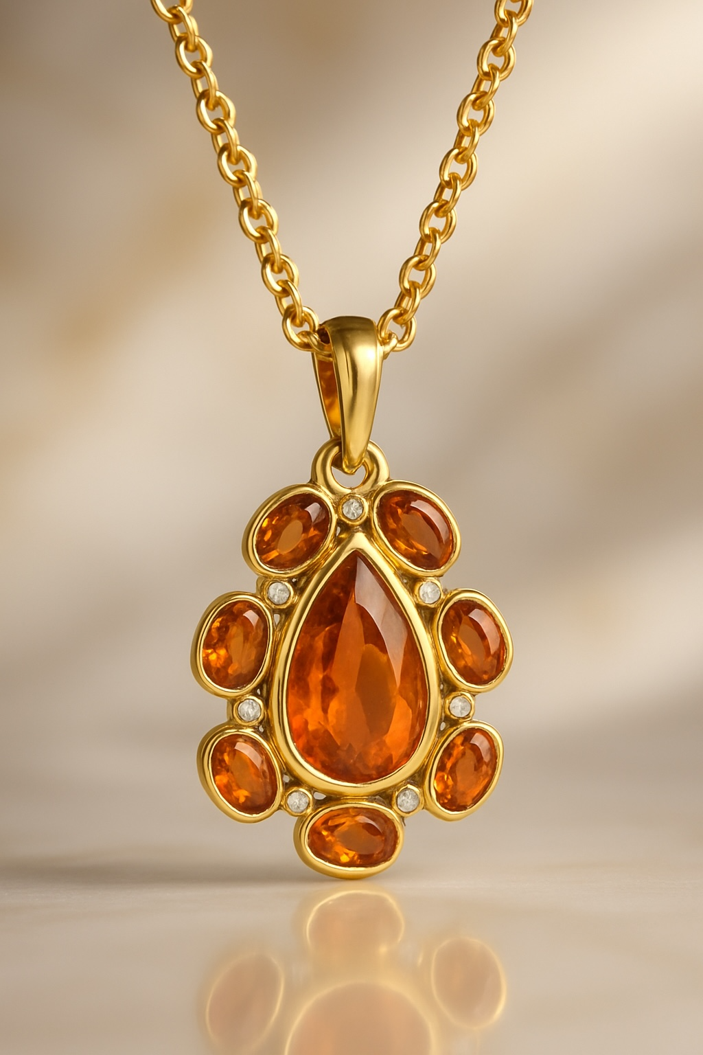 Radiating warmth and brilliance, the Aurora Ignis pendant is a luminous celebration of fire and light. At its heart, a glowing pear-shaped fire opal captures the essence of a rising flame—alive with golden-orange hues and an inner radiance that shifts with every movement.