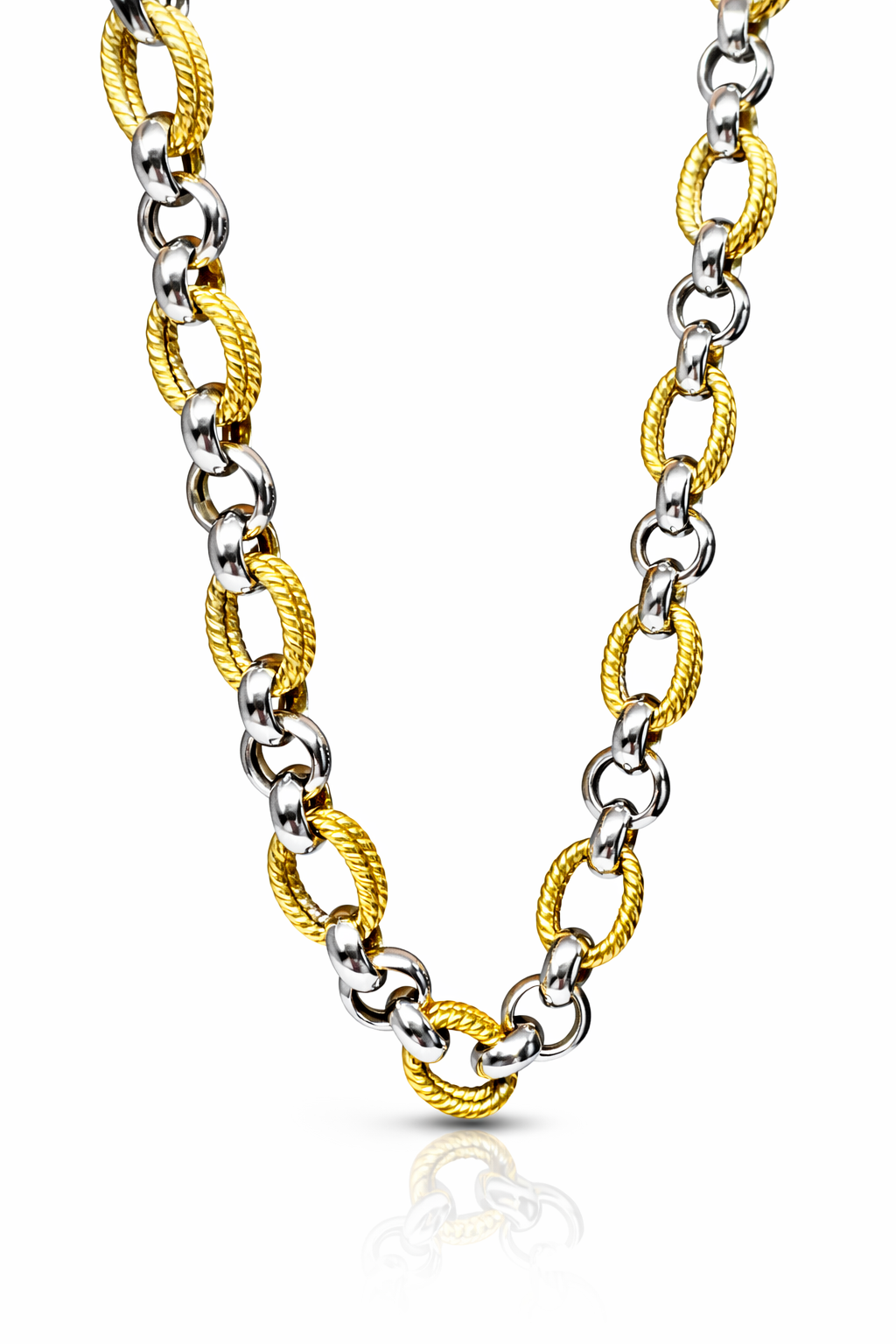 Gracefully intertwining white and yellow gold, the Aurora Twist™ Two-Tone Link Necklace is a refined expression of balance and modern luxury. Each sculpted link features a subtle twisted silhouette, blending warm yellow gold with luminous white gold for a striking contrast that catches the light from every angle. Elegant yet versatile, this necklace transitions effortlessly from day to evening, making it a timeless essential in any fine jewelry collection.
