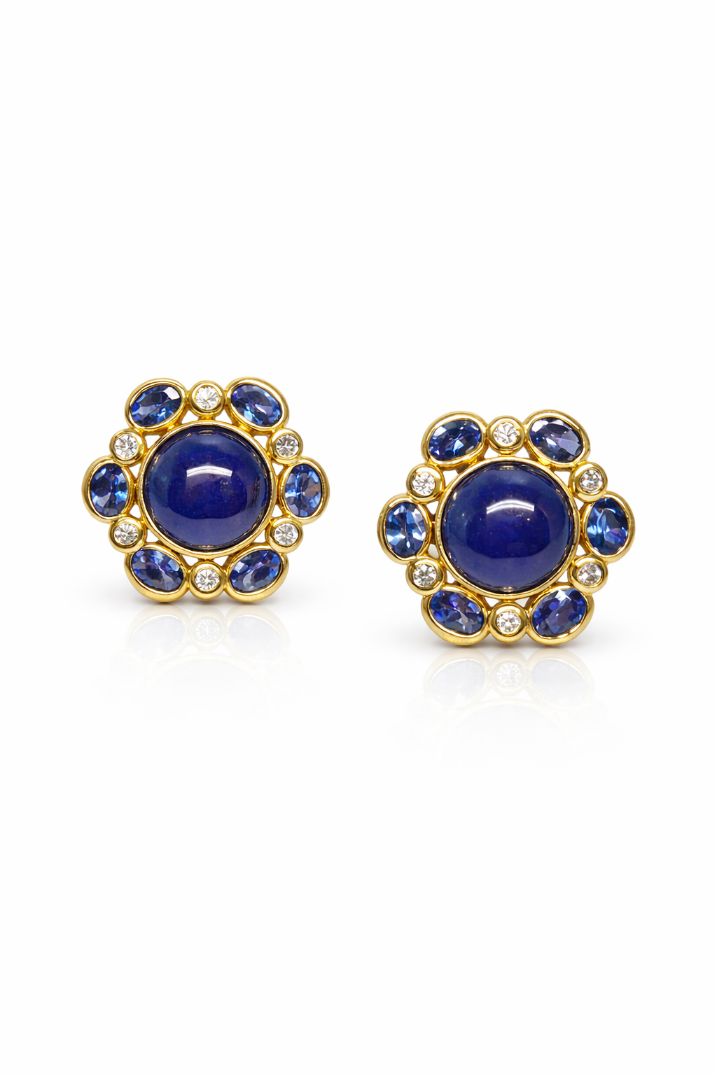 Radiating timeless sophistication, The Azure Fiora Tanzanite Earrings showcase a mesmerizing pair of cabochon-cut tanzanite gemstones, celebrated for their velvety depth and rich violet-blue hue. Each centre stone is gracefully framed by a halo of round brilliant diamonds and faceted tanzanite accents, creating a luminous floral silhouette in warm 18kt yellow gold.