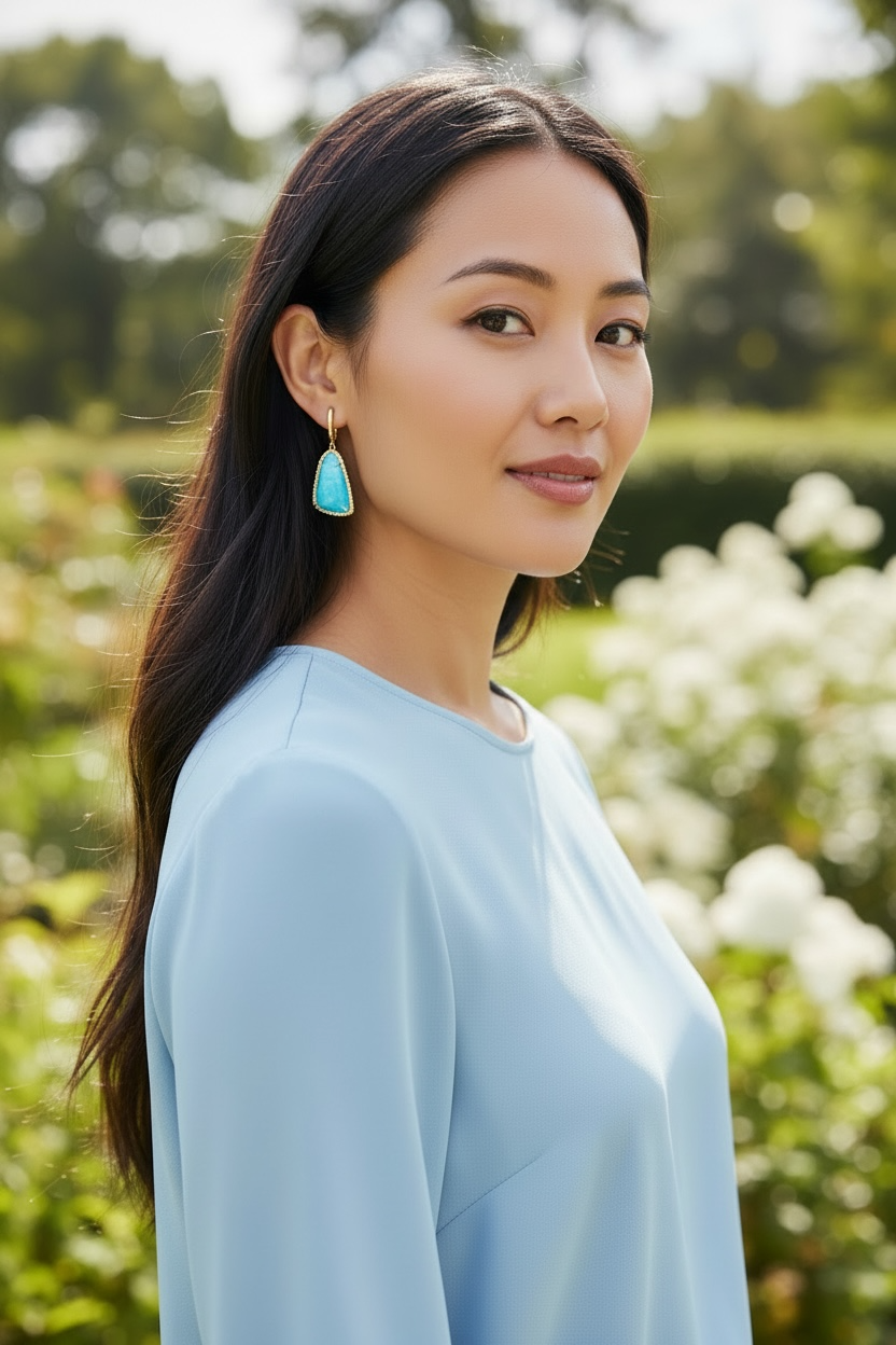 Dive into effortless elegance with the Azure Muse Earrings, where vibrant turquoise cabochons take center stage. Framed by a halo of delicate pavé-set diamonds and suspended from sleek yellow gold hoops, these earrings evoke the serenity of sunlit waters and the radiance of golden shores. Their bold silhouette is balanced by fluid curves, offering a refined statement for both day and evening wear. A luminous blend of color, sparkle, and sophistication.