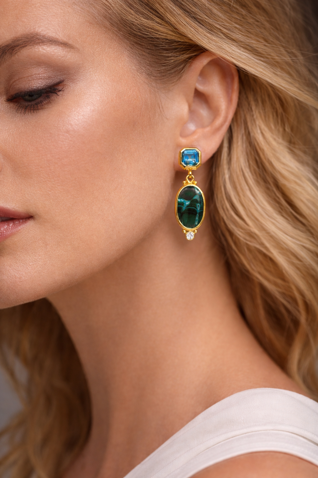 Striking yet sophisticated, these chrysocolla and blue topaz earrings are designed for the woman who appreciates rare gemstones, artistic expression, and elevated luxury.