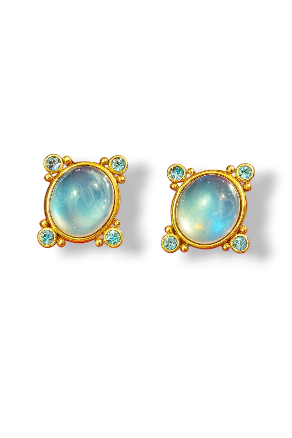 Bathed in golden radiance, the Celeste Aurea Earrings capture the mystique of moonlit skies reflected in tranquil waters. Featuring luminous cabochon blue topaz embraced by glowing 18kt gold and framed with brilliant blue topaz accents, these earrings exude both serenity and grandeur. A timeless fusion of celestial glow and vibrant elegance—perfect for the woman who shines with quiet strength and luminous grace.