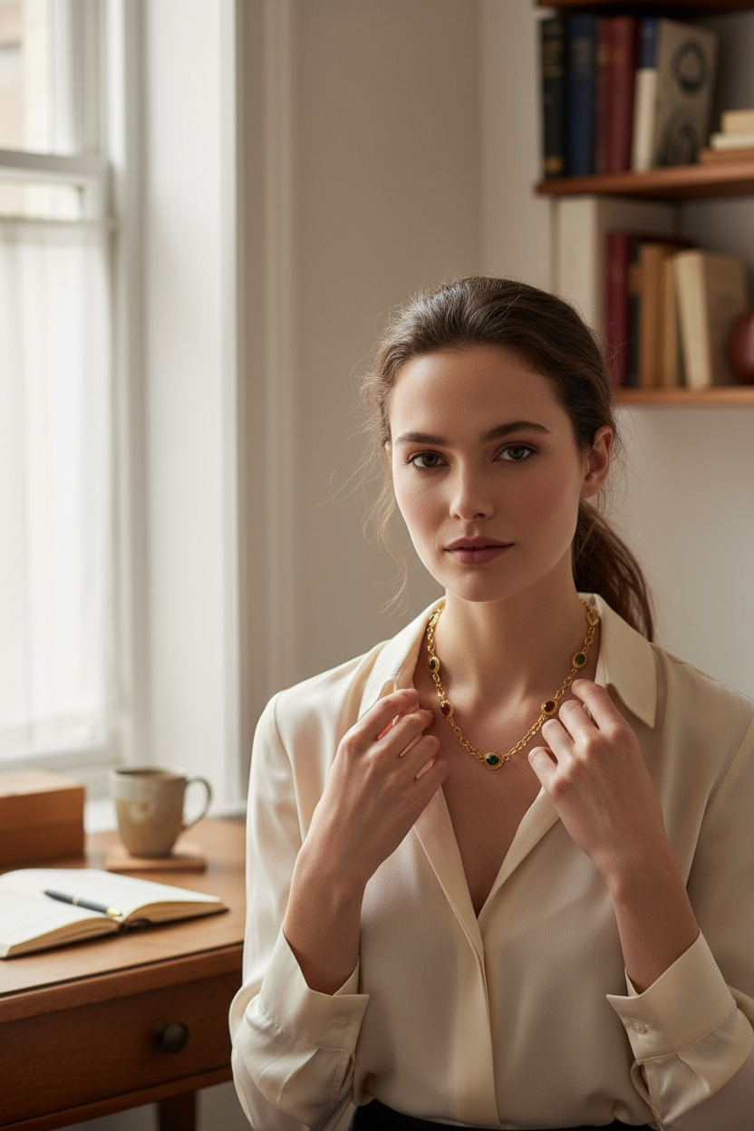A symphony of color and craftsmanship, the Celeste Spectrum Necklace celebrates timeless beauty through a vibrant harmony of gemstones. Each oval cabochon — from deep sapphire blue and verdant green to serene aquamarine and rich garnet — is elegantly bezel-set in luminous 18-karat gold. The delicate hand-crafted links create a graceful rhythm around the neck, allowing every gem to glow with its natural brilliance.