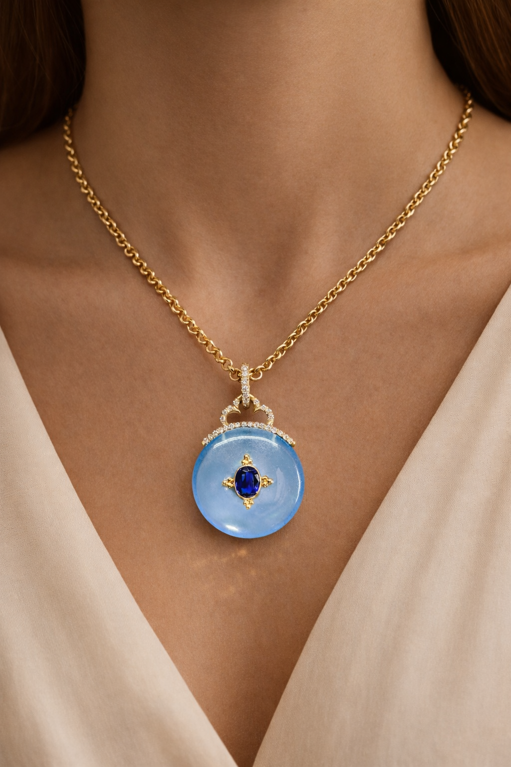 Graceful, luminous, and effortlessly refined, the Celestia Aquamarine Medallion Necklace is a celebration of timeless elegance. Crafted in rich yellow gold, this striking design features a smooth, translucent aquamarine disc that glows with serene blue tones, evoking the calm of open skies and crystal waters.