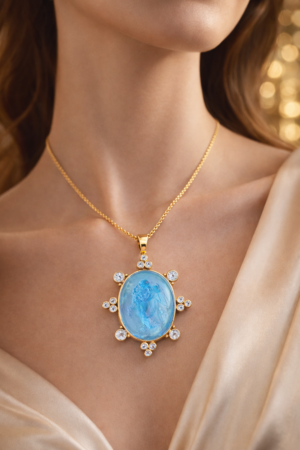 A timeless ode to classical beauty, the Celestia Intaglio Pendant features a luminous blue intaglio, delicately carved to reveal an ethereal figure suspended within translucent depths. Framed in rich yellow gold, the centerpiece is gracefully accented by brilliant blue topaz and diamond details that radiate outward like constellations, adding light, balance, and refined symmetry. Elegant yet powerful, this pendant evokes ancient artistry reimagined through modern craftsmanship—an heirloom-worthy jewel designed to captivate, inspire, and endure.