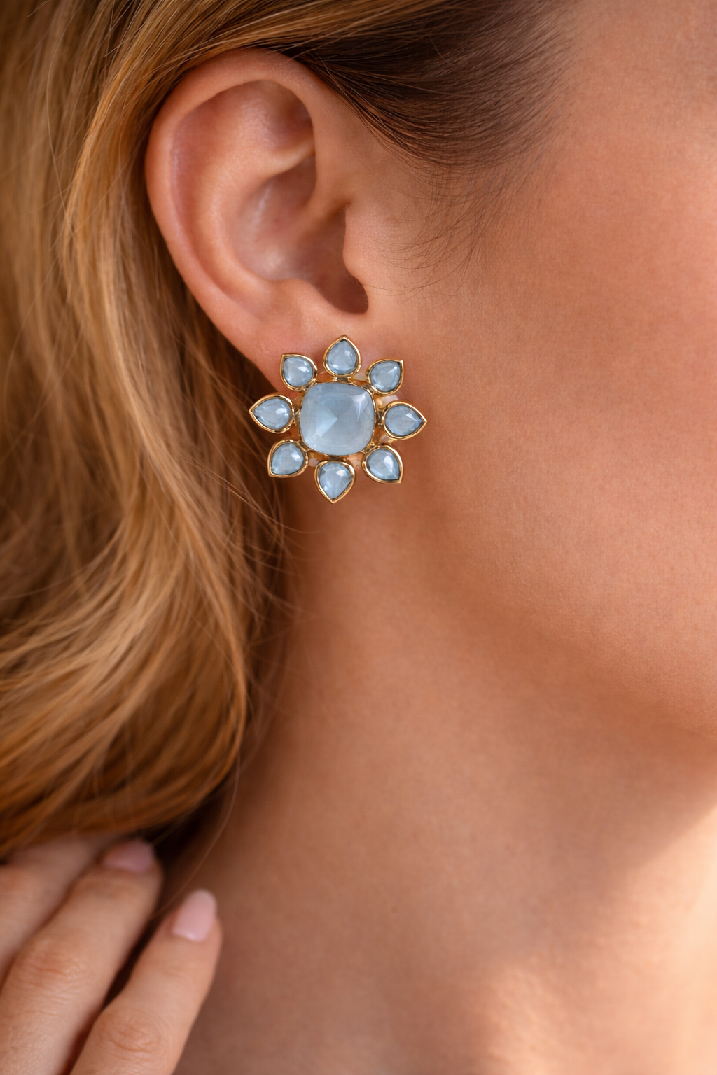 Radiant and refined, the Celestia Sunburst Earrings celebrate light in its most elegant form. A luminous central blue topaz is encircled by petal-shaped blue topaz accents, creating a graceful sunburst silhouette inspired by classical design and timeless femininity. Set in warm yellow gold, the soft sky-blue tones shimmer with every movement, evoking clarity, serenity, and understated luxury.