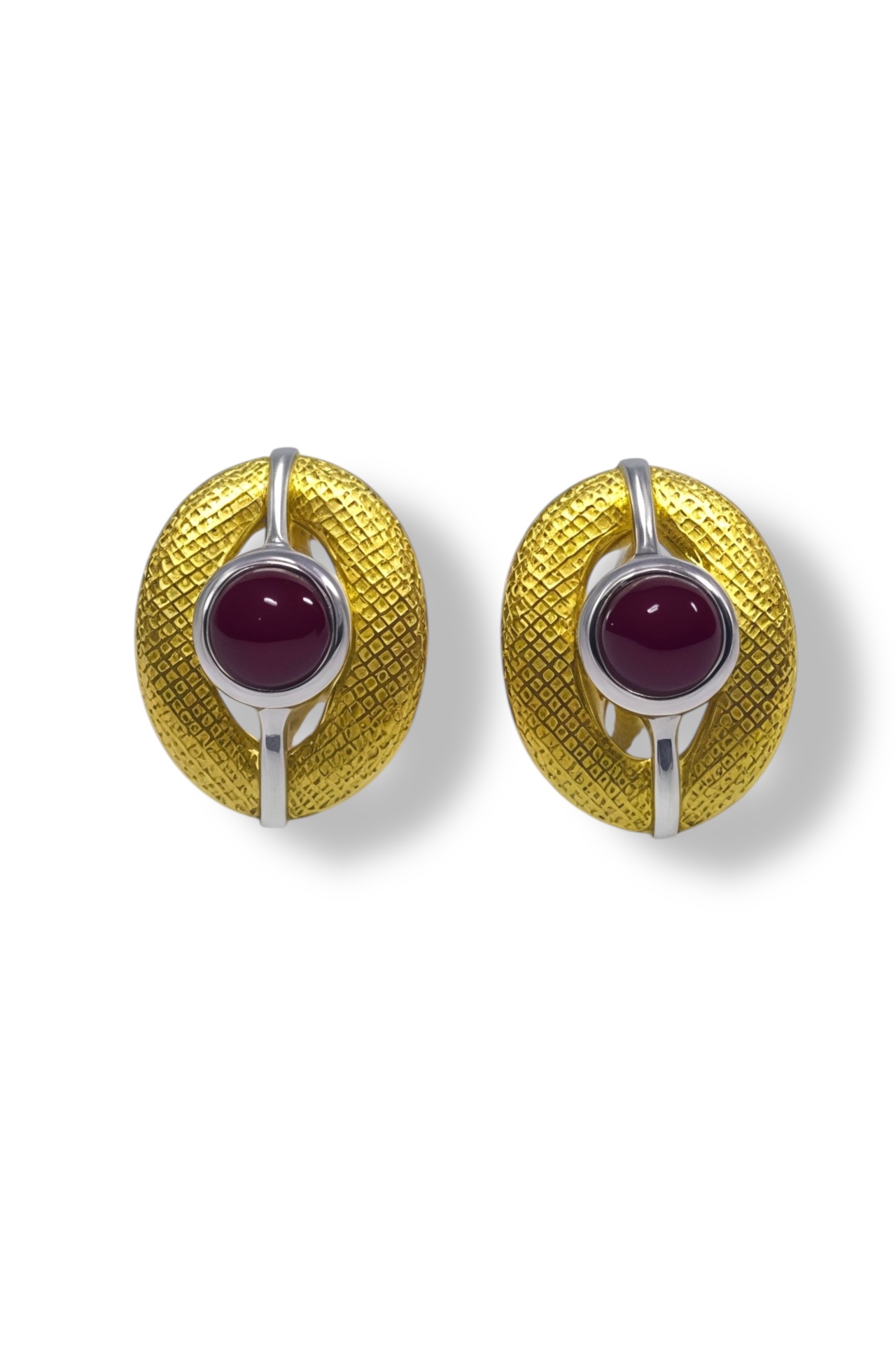 A harmonious blend of timeless artistry and modern elegance, the Celestial Embrace Earrings feature deep, rich cabochon gemstones at their heart, symbolizing passion and strength. The warm glow of intricately textured yellow gold wraps gracefully around the center stone, while sleek white gold accents provide a striking contrast, creating a perfect balance of light and shadow. These earrings evoke the feeling of a celestial dance — radiant, powerful, and endlessly captivating — making them the ultimate statement of refined luxury.