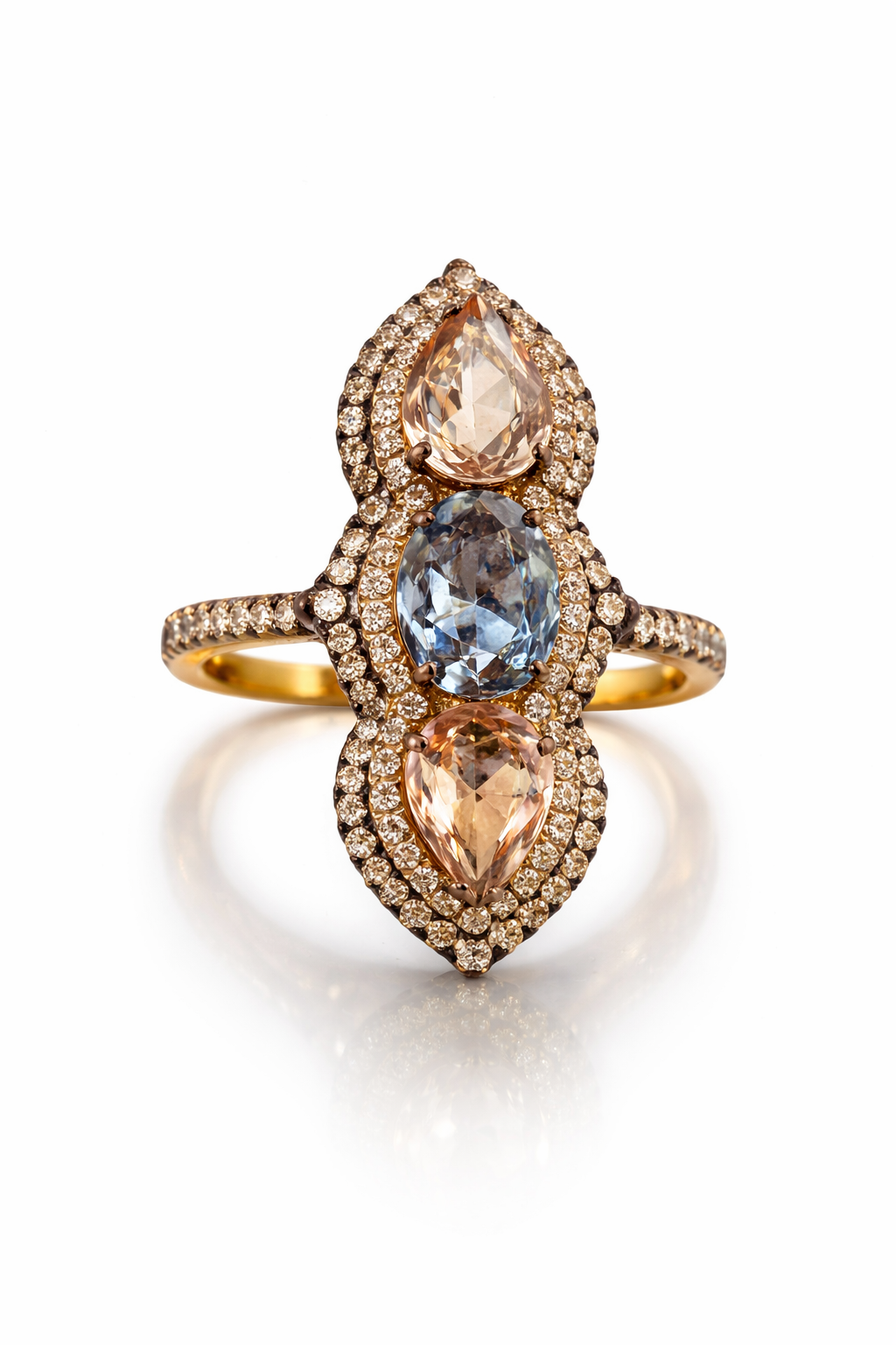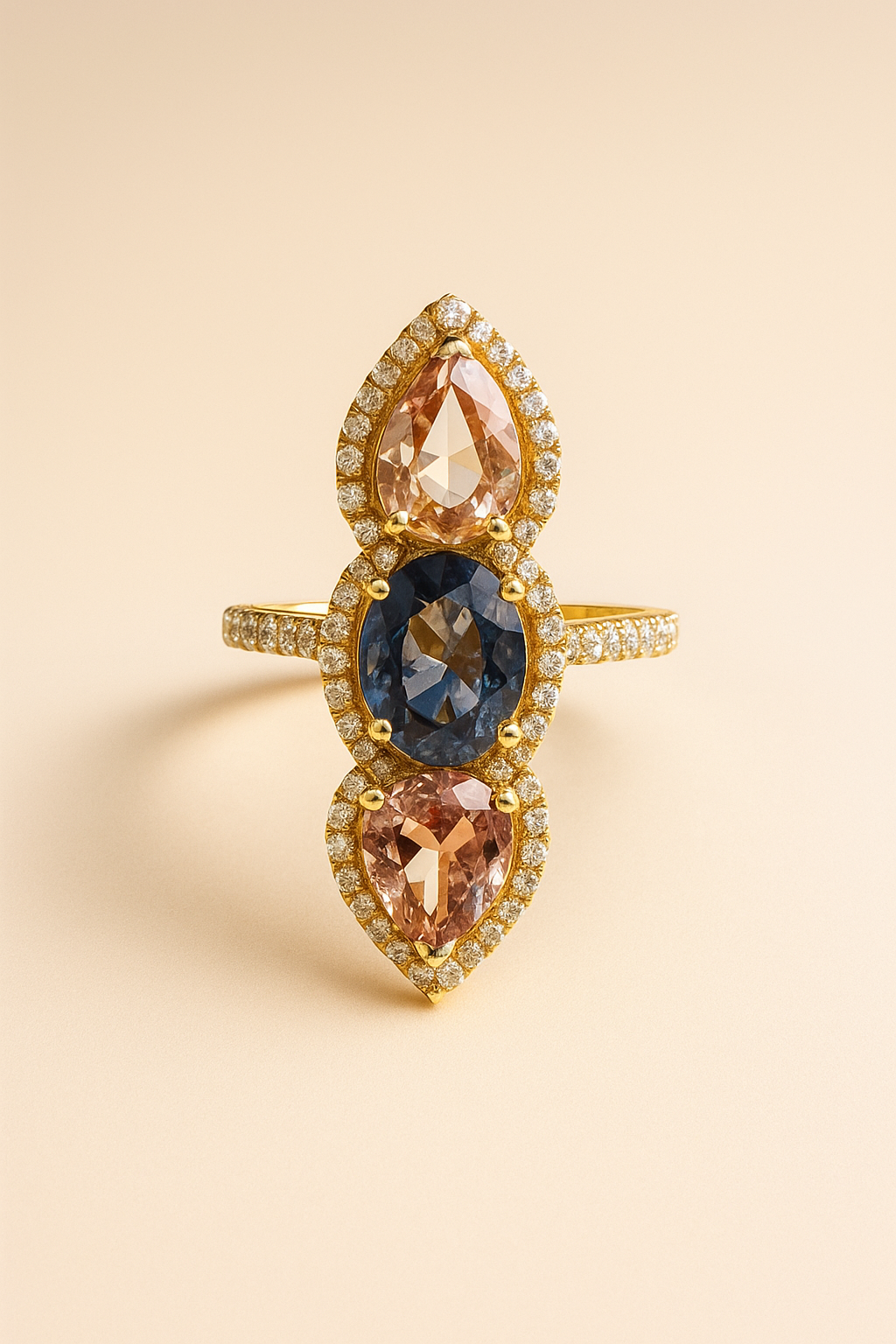 A harmonious dance of color and brilliance, Celestial Serenade captures the essence of night meeting dawn. Set in radiant yellow gold, this elongated masterpiece features a serene blue sapphire embraced by two soft yellow sapphires, all encircled by double halos of shimmering diamonds set in contrasting blackened gold. The interplay of warm and cool tones creates a dramatic silhouette—bold, refined, and eternally luminous. A statement of elegance for the woman who commands the room.