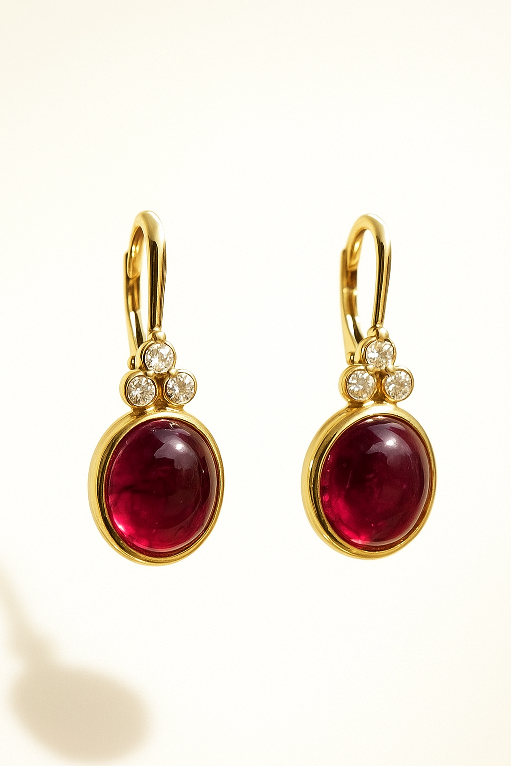 Elegant with a touch of quiet drama, the Crimson Poise earrings are designed to captivate without excess. Each earring features a rich, cabochon-cut pink tourmaline glowing from within, its deep rose hue framed in polished yellow gold. The smooth, domed gemstone offers a sensual softness, catching the light with understated intensity.