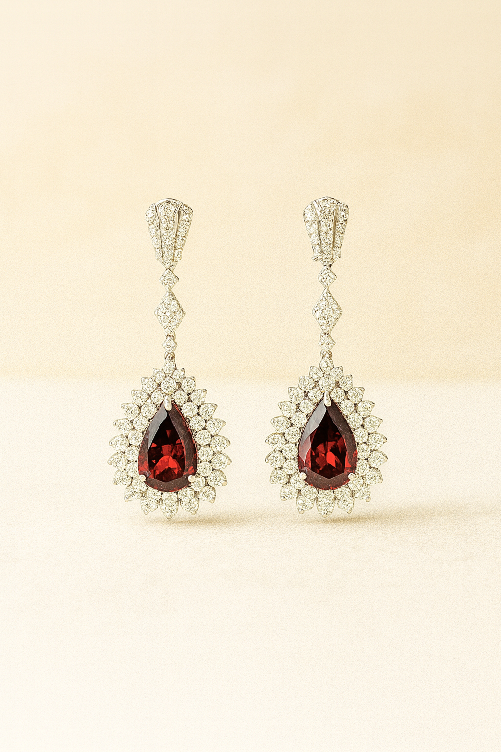 Indulge in opulence with the Crimson Radiance Dangles, a breathtaking fusion of fiery elegance and timeless brilliance. Each earring features a deep, velvety pear-shaped garnet—its rich crimson hue glowing like embers at dusk—framed by an extravagant double halo of meticulously set brilliant-cut diamonds. The cascading diamond-encrusted drop brings fluid movement and irresistible sparkle, creating an unforgettable shimmer with every turn of the head.