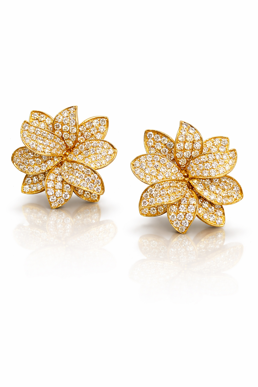A celebration of light, symmetry, and timeless femininity, the Aurelia Bloom Diamond Flower Earrings are crafted in radiant yellow gold and meticulously pavé-set with brilliant diamonds. Each petal unfolds with sculptural precision, creating a luminous floral silhouette that captures and reflects light from every angle.