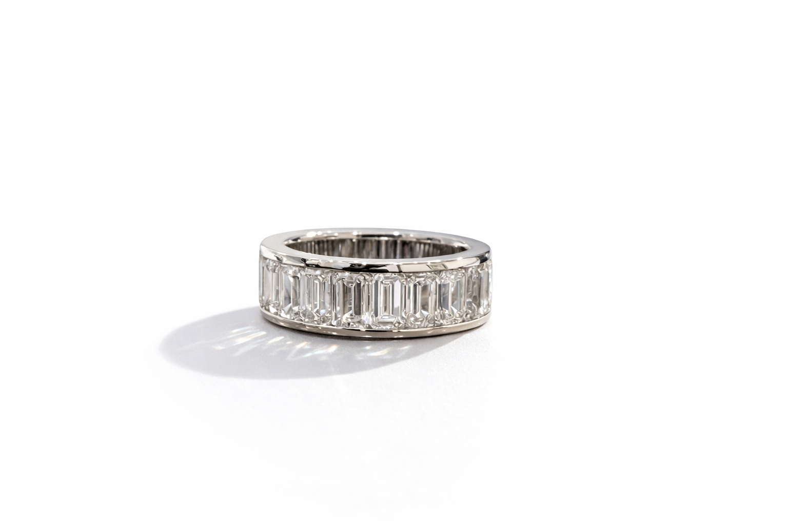 Refined, architectural, and effortlessly luxurious, the Emerald Éclat Band showcases 3.00 carats total weight of emerald-cut diamonds precision-set in a sleek channel design. Each step-cut diamond is perfectly aligned, creating a continuous ribbon of light with clean lines and a modern, sophisticated presence.