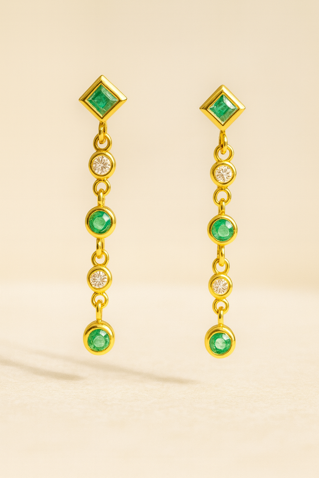 Step into a realm of timeless elegance with The Elysian Grove Earrings. Crafted in lustrous yellow gold, these exquisite dangling earrings are a symphony of radiant green emeralds and sparkling diamonds. Multi-shaped emeralds, bezel-set with precision, dangle gracefully, their rich, verdant hues evoking the serene beauty of a mythical forest. Interspersed with brilliant diamonds, each stone catches the light with every movement, adding an ethereal shimmer. Perfectly designed for the woman who loves sophistication with a touch of nature’s elegance, these earrings are a true statement of refined luxury.