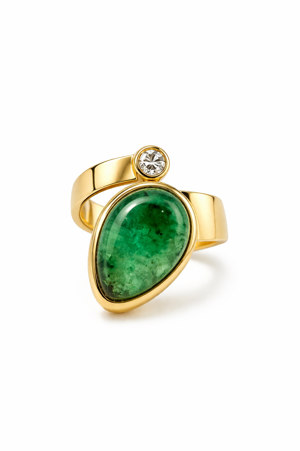 Bold, artistic, and unmistakably refined, the Esmé Emerald Ring is a striking expression of modern luxury. Designed in rich yellow gold, this sculptural ring showcases a vivid pear-shaped emerald in a sleek bezel setting, accented by a brilliant round diamond for a touch of contrast and light.