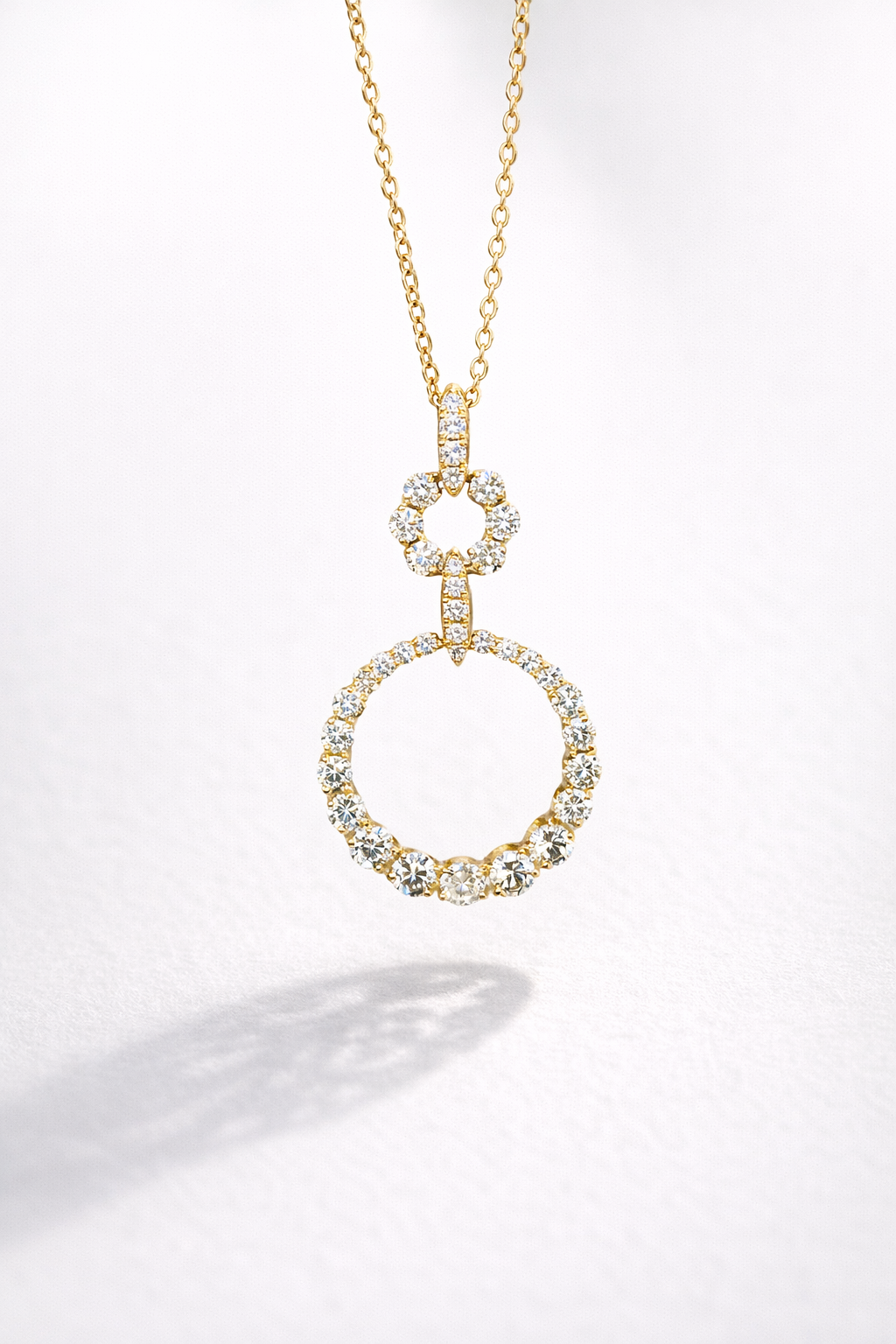 A delicate diamond-accented link connects the halo to its fine rose gold chain, adding a subtle architectural touch and enhancing the pendant’s fluid silhouette. Minimal yet striking, the circular motif represents unity, continuity, and everlasting beauty—making it a meaningful piece for everyday wear or special occasions.