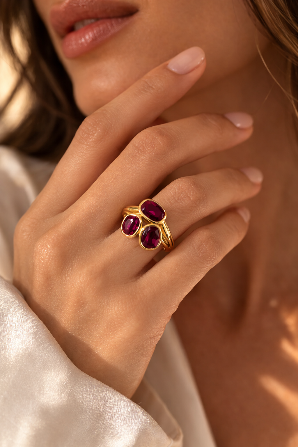 Bold, passionate, and unmistakably luxurious, the Firenze Ruby Trilogy Ring celebrates the timeless beauty of vivid rubies set in luminous yellow gold. Three richly coloured oval rubies are gracefully arranged in a sculptural bezel setting, creating a striking composition of colour, light, and refined elegance.