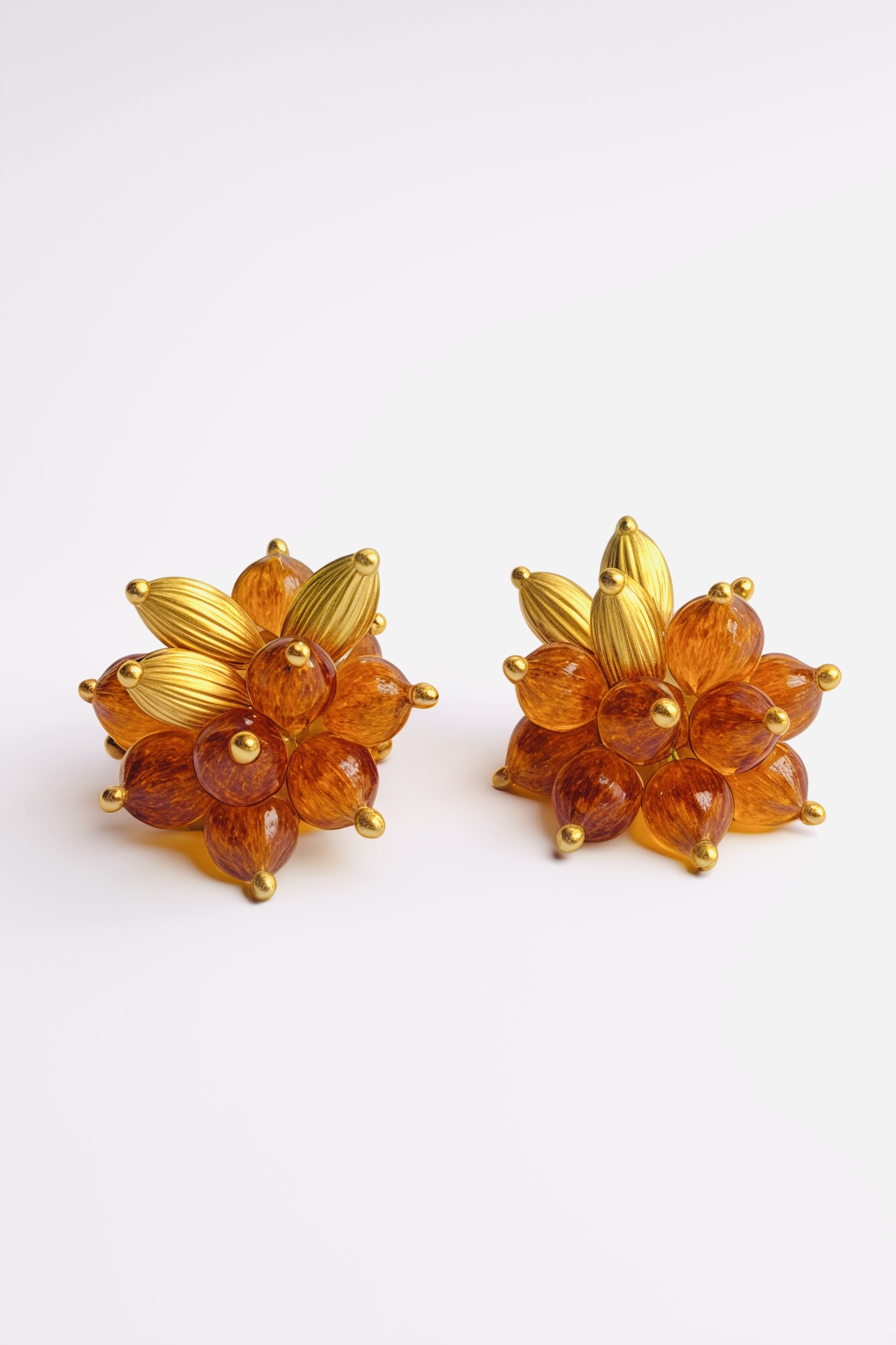 Radiating warmth and sophistication, the Golden Ember Bloom Earrings capture the fiery essence of a sunset. Crafted in rich yellow gold, each petal-shaped element is adorned with glowing amber drops, creating a captivating dance of light and texture. Bold yet refined, these earrings are a true statement of artistry—perfect for adding a touch of timeless elegance to any ensemble.