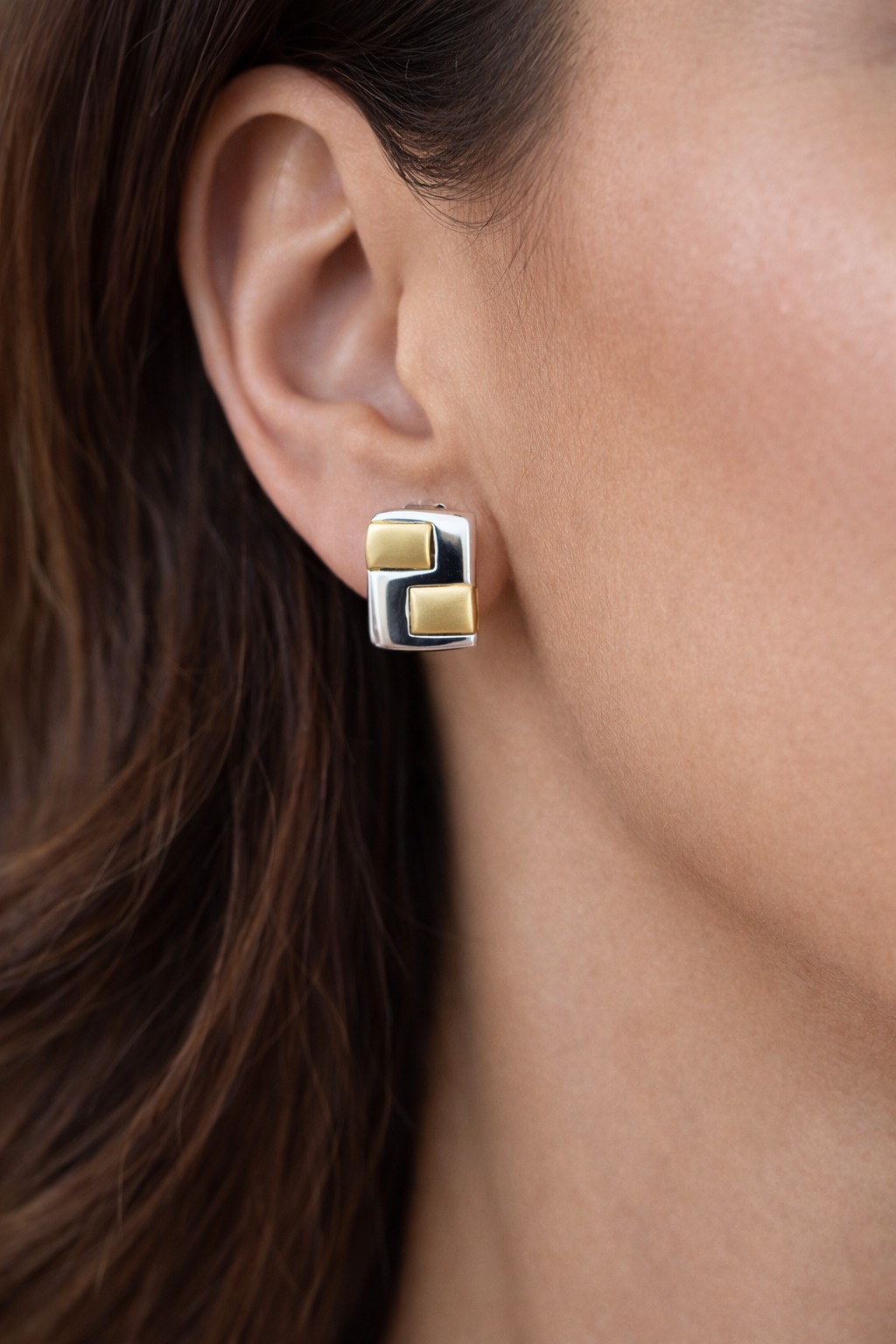 Designed for the modern woman who appreciates fine craftsmanship and quiet elegance, these two-tone gold earrings elevate any look with subtle brilliance and architectural grace.