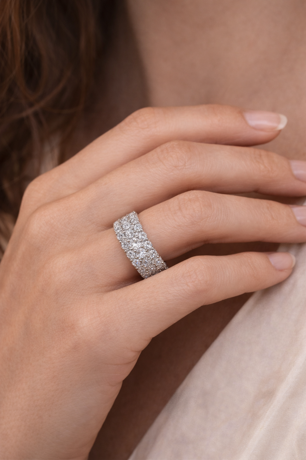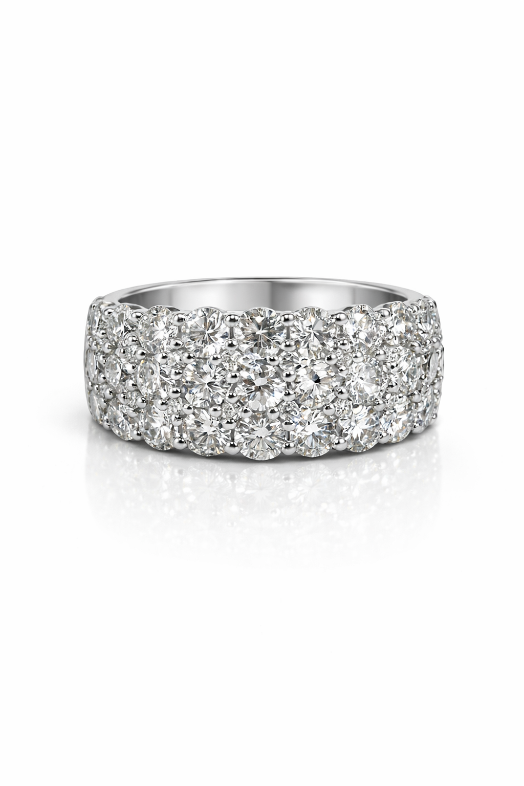 A radiant statement of modern elegance, the Lumière Pavé Cocktail Band is designed to captivate from every angle. Rows of meticulously pavé-set round brilliant diamonds create a continuous surface of light, delivering exceptional sparkle and a luxurious, substantial presence on the finger. Bold yet refined, this diamond cocktail band transitions effortlessly from evening glamour to elevated everyday wear, making it a timeless addition to any fine jewelry collection.