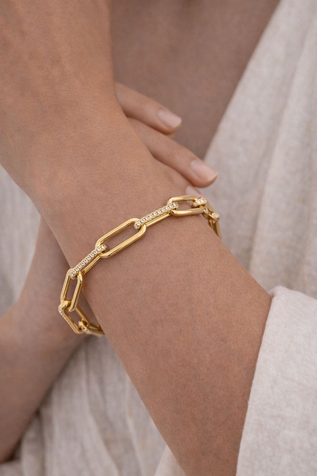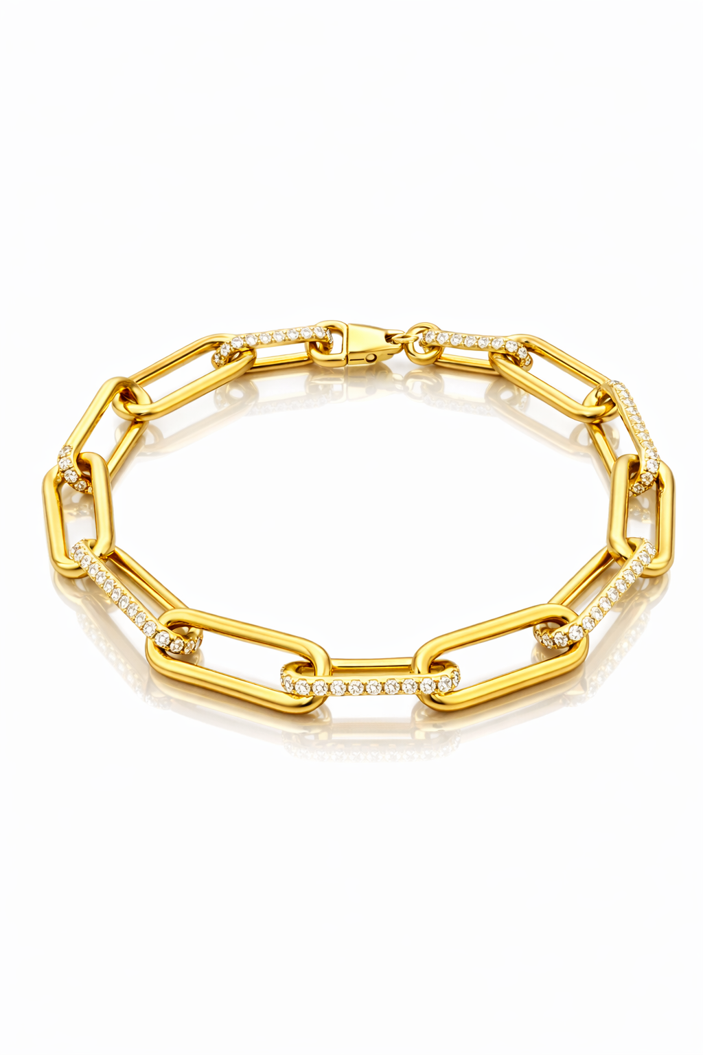 This stunning bracelet features high-polish yellow gold, its radiant shine enhanced by interlocking links encrusted with shimmering diamonds. Each link dances with light, creating a symphony of sparkle and sophistication. The perfect blend of modern luxury and classic design, Luminara is an exquisite statement piece, destined to elevate any occasion with its graceful allure.
