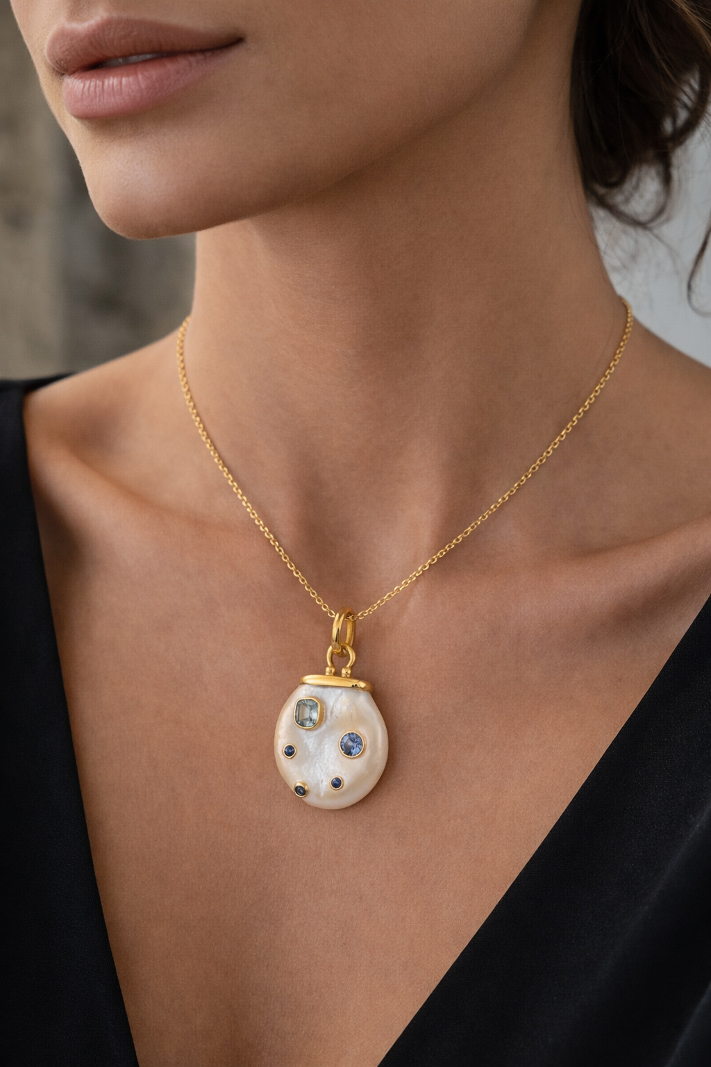 A statement of quiet luxury, The Luminara captures the essence of refined elegance through the harmony of nature and craftsmanship. At its heart rests a luminous, organically shaped pearl—its soft, iridescent glow evoking timeless sophistication. Set within are hand-selected tanzanite gemstones, their delicate violet-blue hues offering a striking yet graceful contrast, each bezel-set to enhance both brilliance and security.