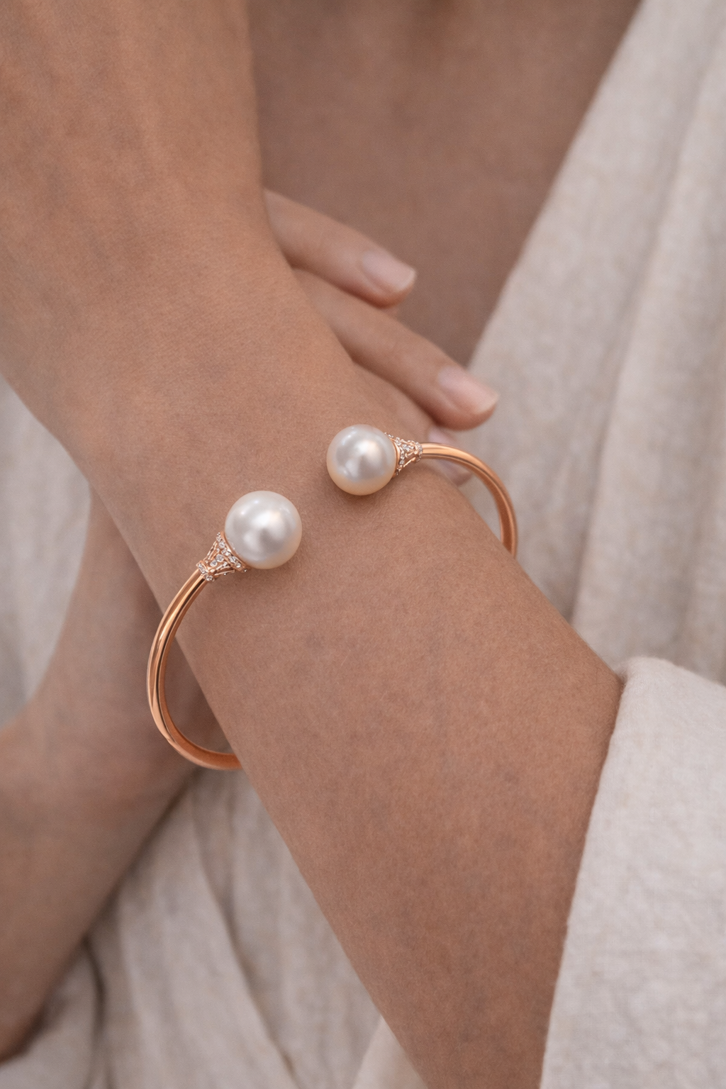 Gracefully modern yet timelessly refined, Luna Embrace is a rose gold open bangle adorned with lustrous pearls at each end—each delicately crowned with pavé-set diamonds. This radiant piece captures the soft glow of moonlight and the effortless elegance of a woman who shines in her own light. A statement of poise, purity, and sophistication.