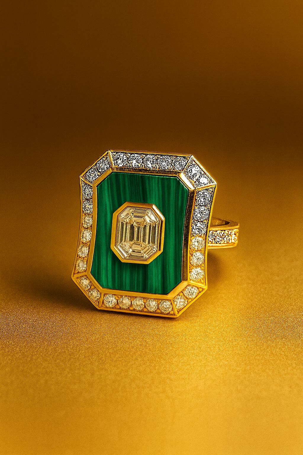 Command attention with the bold elegance of the Emerald Époque ring — a masterpiece of Art Deco revival. A rich malachite inlay, radiant with natural striations of green, sets the stage for a bezel-set emerald-cut diamond at its center, radiating brilliance. Framed in lustrous 18K yellow gold and encircled by a double halo of pavé diamonds, this architectural statement piece channels vintage glamour with a modern edge. A ring that celebrates opulence, artistry, and unapologetic individuality.