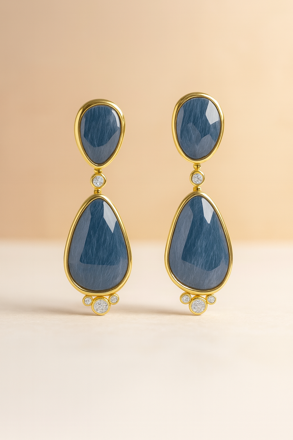 A symphony of elegance, the Midnight Serenade Earrings capture the mystery of twilight skies. Deep, faceted blue sapphires are framed in rich 18kt yellow gold, their velvety hues glowing with quiet sophistication. A constellation of bezel-set diamonds adds a luminous touch, dancing with light at every angle. Graceful and timeless, these earrings are a statement of refined artistry — where night’s allure meets everlasting brilliance.