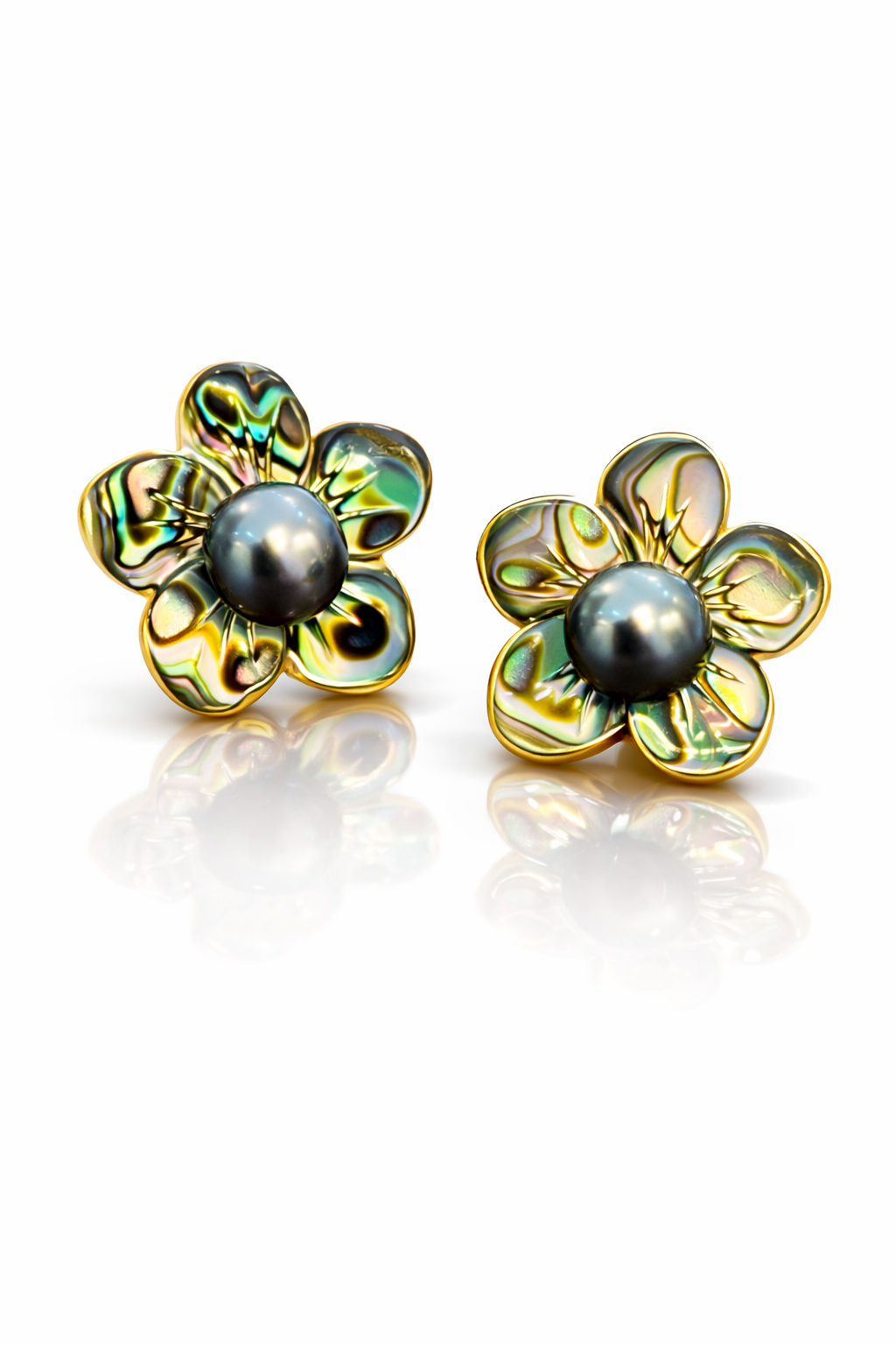 At the center, luminous Tahitian pearls glow with natural charcoal-silver overtones—rich, rare, and unmistakably alive. Designed with removable flower-cut mother-of-pearl jackets, the earrings transform effortlessly: wear the pearls alone as refined, minimalist studs, or add the sculpted floral layer to bloom into a soft, radiant statement. The mother-of-pearl petals shimmer like light dancing across ocean shells, framing the pearl in organic elegance.