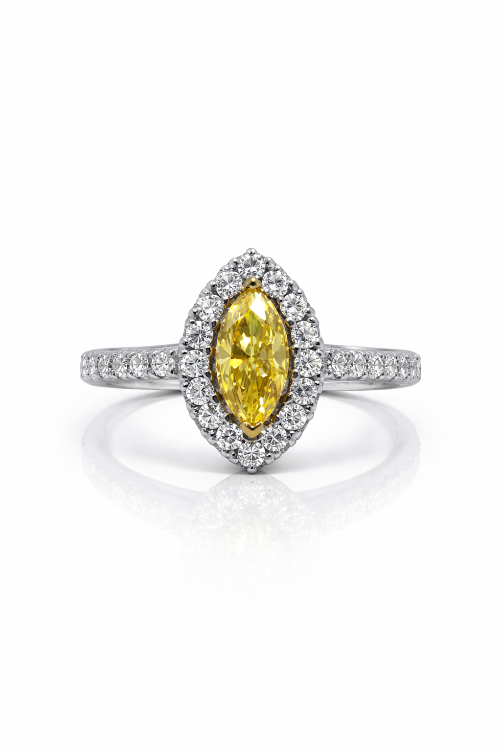Distinctive, luminous, and undeniably romantic, the Soleil Marquise Halo Ring is a breathtaking choice for those seeking a natural yellow diamond engagement ring that stands apart.
