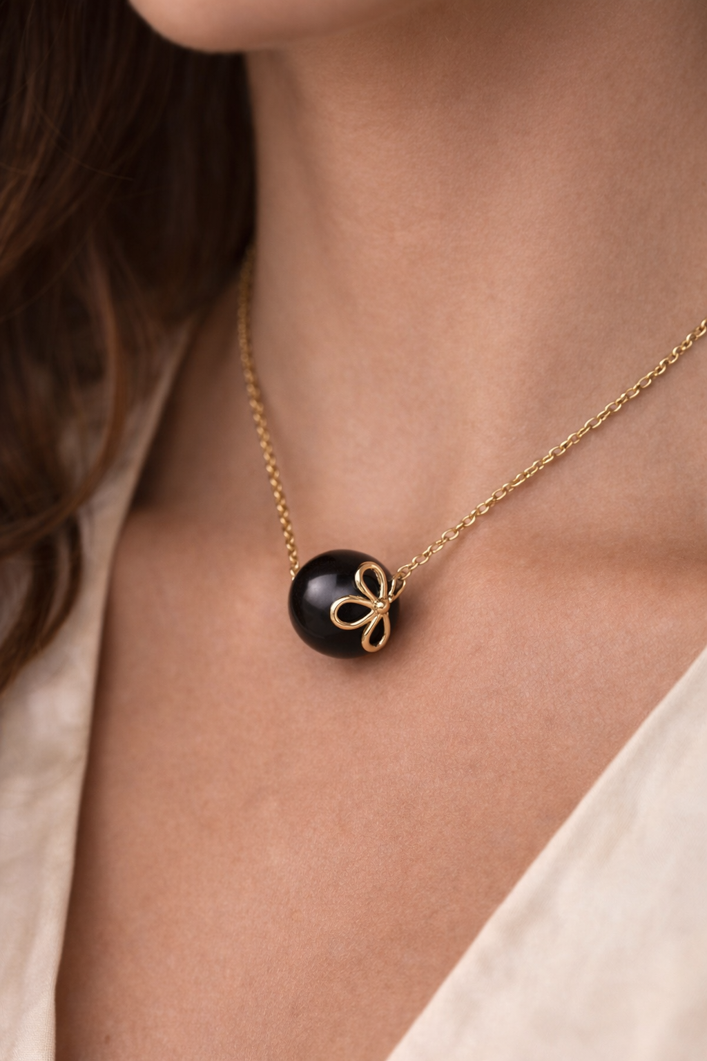 A vision of timeless sophistication, the Noir Élégance Necklace features a mesmerizing Tahitian pearl, its deep luster cradled by delicate loops of luminous yellow gold. The smooth orb of midnight radiance captures light with a mysterious glow, symbolizing strength and grace in perfect harmony. Effortlessly refined and endlessly versatile, this piece transforms understated luxury into an art form — designed for the woman who carries elegance in every detail.