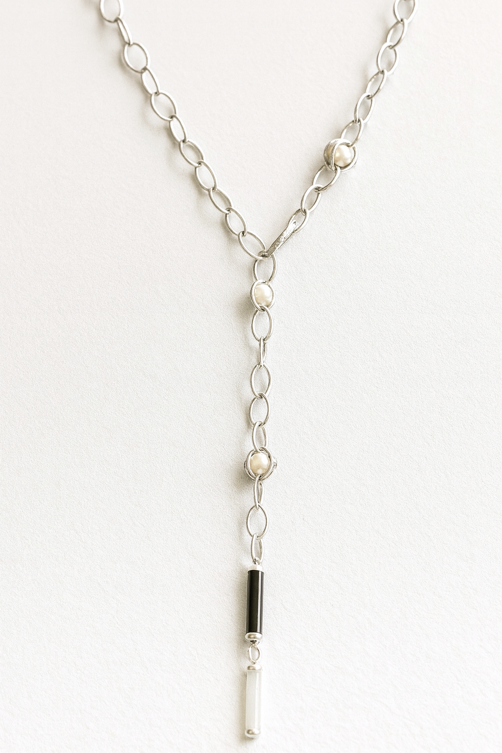 Sleek, refined, and effortlessly modern — the Noir Lumière Lariat Necklace embodies the art of contrast. Crafted in 18kt white gold, this Italian-designed piece features a graceful chain of oval links accented by luminous cultured pearls and polished black onyx bars. The Y-shaped silhouette drapes elegantly, capturing light with every movement and creating a timeless interplay between shadow and shine. Perfect for both day and evening wear, it’s a statement of understated sophistication.