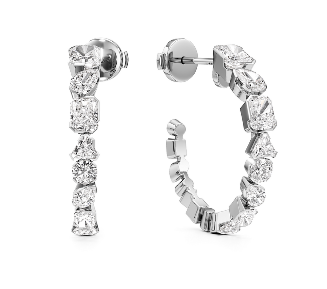 18kt white gold multi shape diamond cut hoop earrings.