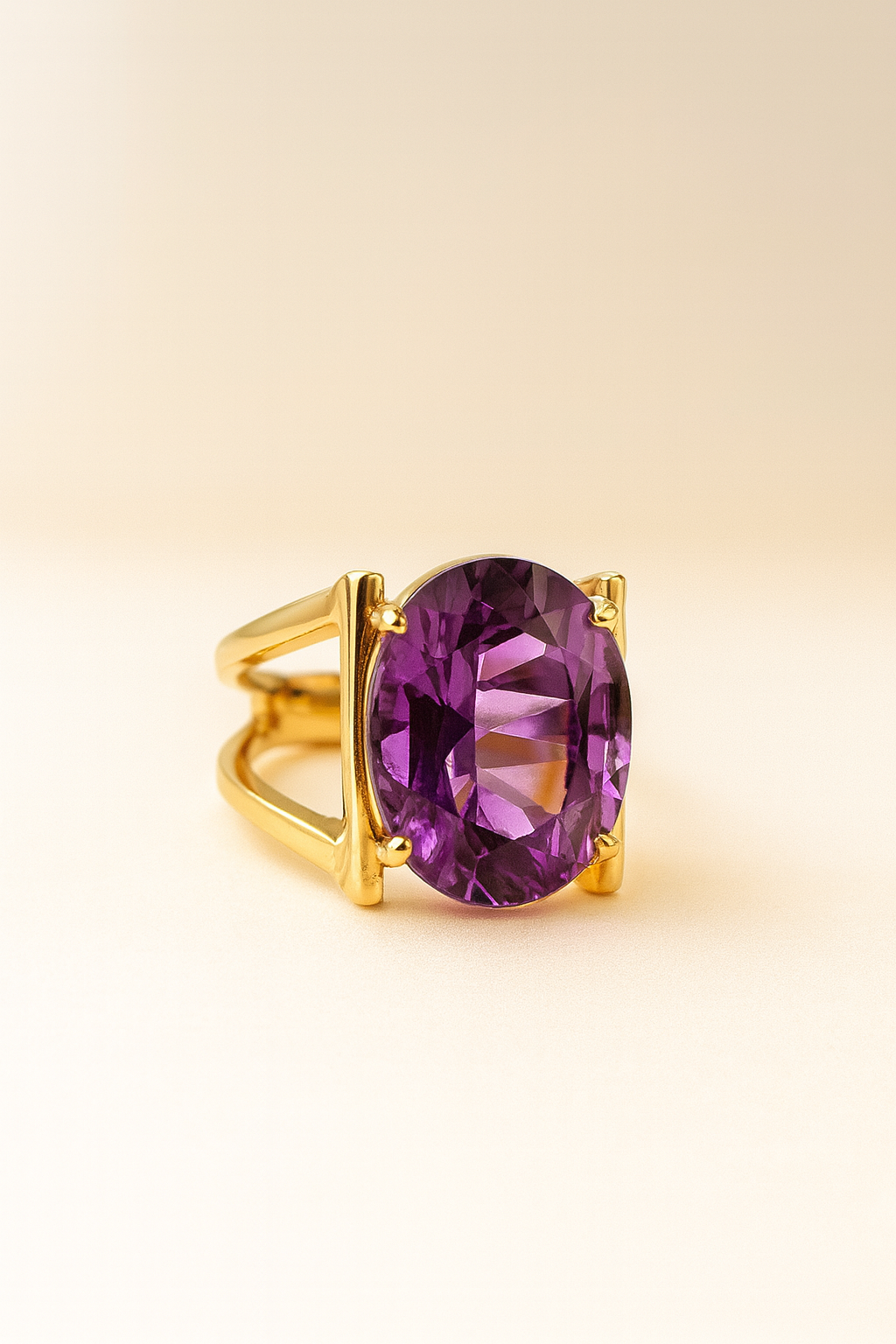 Bold, sculptural, and undeniably regal, The Royal Amethyst Crest celebrates the power and beauty of color. A luminous oval-cut amethyst—rich with deep violet fire—takes center stage in a commanding gold setting designed with statement-worthy geometry. The wide, gracefully contoured band embraces the gemstone with strength and elegance, allowing its natural brilliance to shine from every angle.