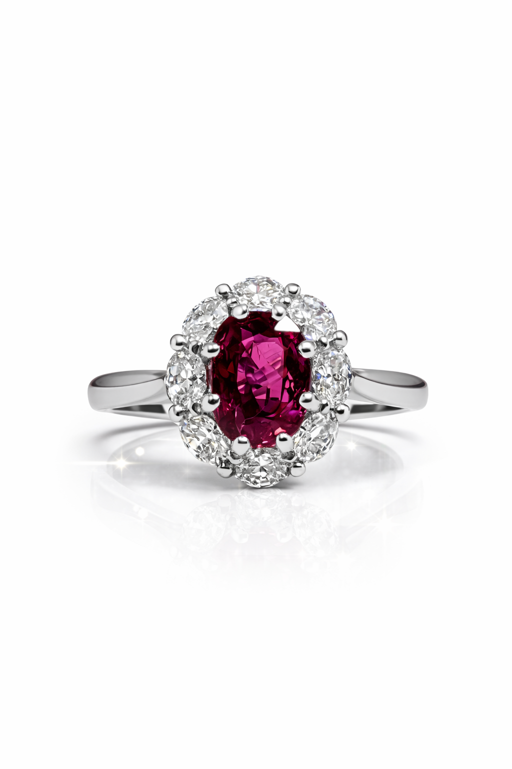 Glimmering with timeless elegance, behold the captivating allure of this exquisite ruby diamond ring, a symphony of sophistication and grace. At its heart, a resplendent 1.30-carat ruby, a crimson beacon of passion and vitality, commands attention with its fiery hue and exceptional clarity. Nestled in a bed of lustrous platinum, this majestic gemstone is cradled in a setting of unparalleled craftsmanship.