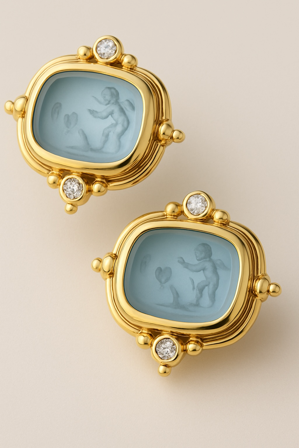 Inspired by the timeless romance of ancient cameos and Byzantine artistry, the Seraphina Intaglio Diamond Earringscapture celestial beauty in its most refined form. Each earring features a softly carved angel intaglio, delicately etched into luminous stone and framed in rich yellow gold. Accented with brilliant round diamonds, the design evokes protection, grace, and eternal elegance.