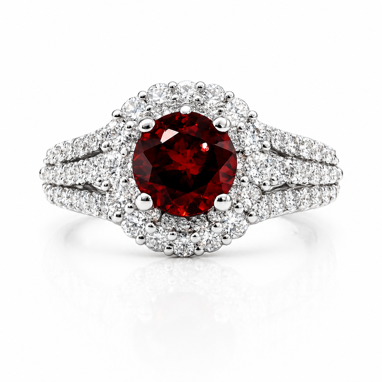 Encircling the center stone is a luminous diamond halo, meticulously set to amplify the spessartite’s natural intensity while adding layers of brilliance from every angle. The pavé diamond band in polished white gold enhances the overall radiance, creating a seamless flow of sparkle and elegance.