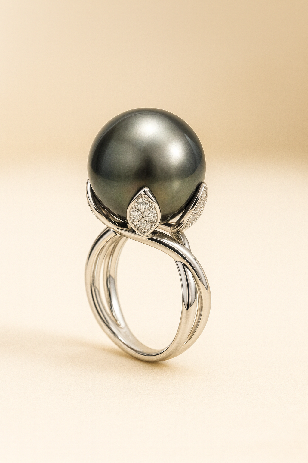 Graceful, sculptural, and irresistibly captivating, The Tahitian Bloom Ring blossoms with natural elegance. At its heart sits a lustrous Tahitian pearl—deep, enigmatic, and glowing with shades of charcoal, silver, and peacock green. The pearl is cradled by diamond-encrusted petals, each one delicately shaped to echo the curves of a blooming flower.