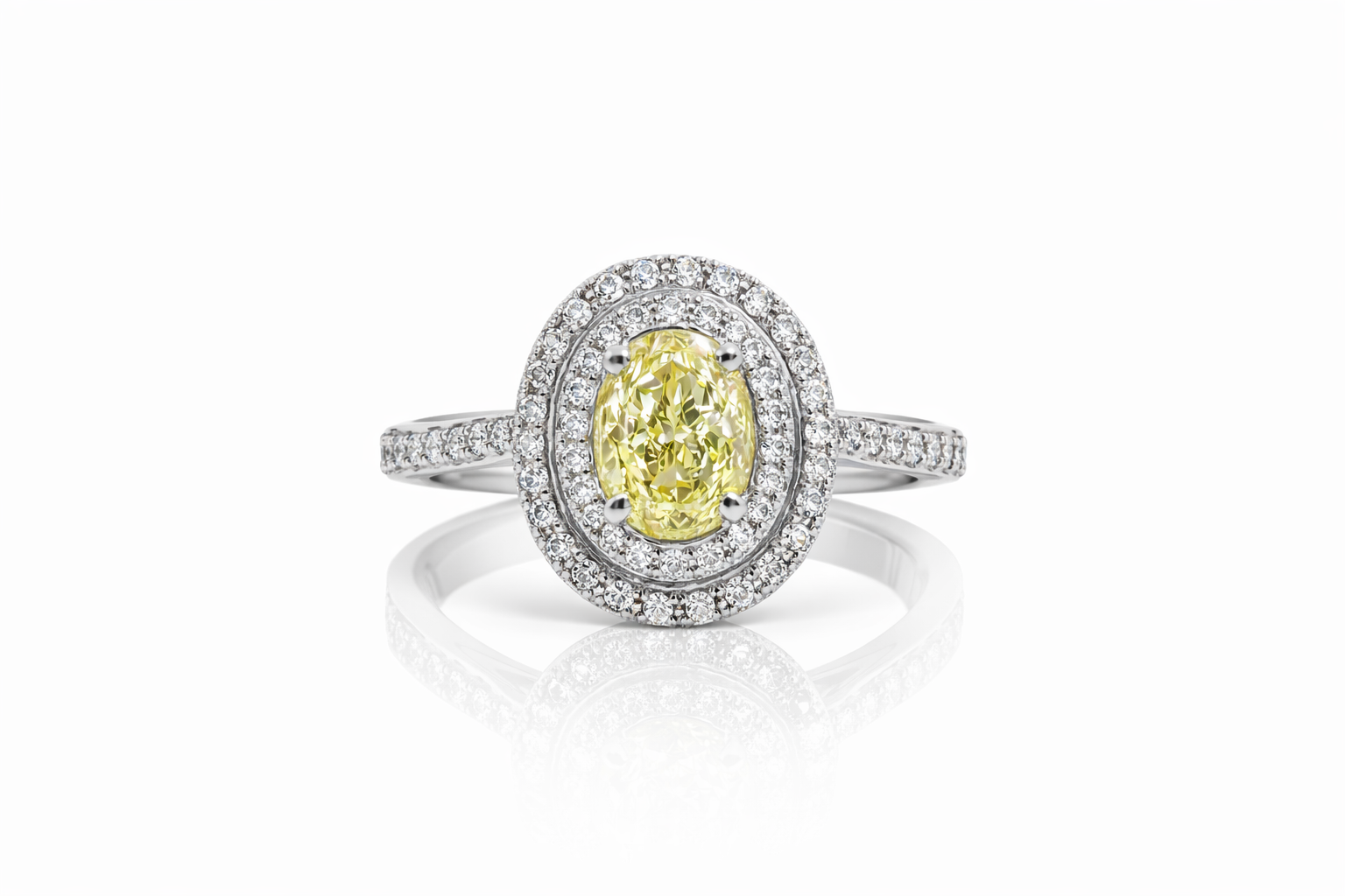 Set in polished white gold, the delicate pavé diamond band adds a refined sparkle, while the graceful silhouette enhances the elongated elegance of the oval cut. The contrast between the vivid yellow center and the icy brilliance of the surrounding diamonds creates a look that is both striking and sophisticated.