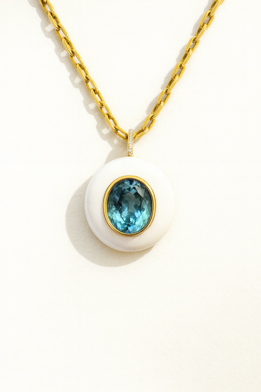 Inspired by the sunlit allure of the Italian coast, The Capri Medallion Necklace captures the essence of timeless Mediterranean elegance. A vivid oval blue topaz glows at its center—its crystalline depths reminiscent of Capri’s azure waters—encased in a smooth white agate frame that radiates purity and balance. Suspended from a sculpted 18kt yellow gold chain, the piece blends bold color with refined sophistication. A modern heirloom that evokes both serenity and strength, The Capri Medallion Necklace is the epitome of effortless luxury.