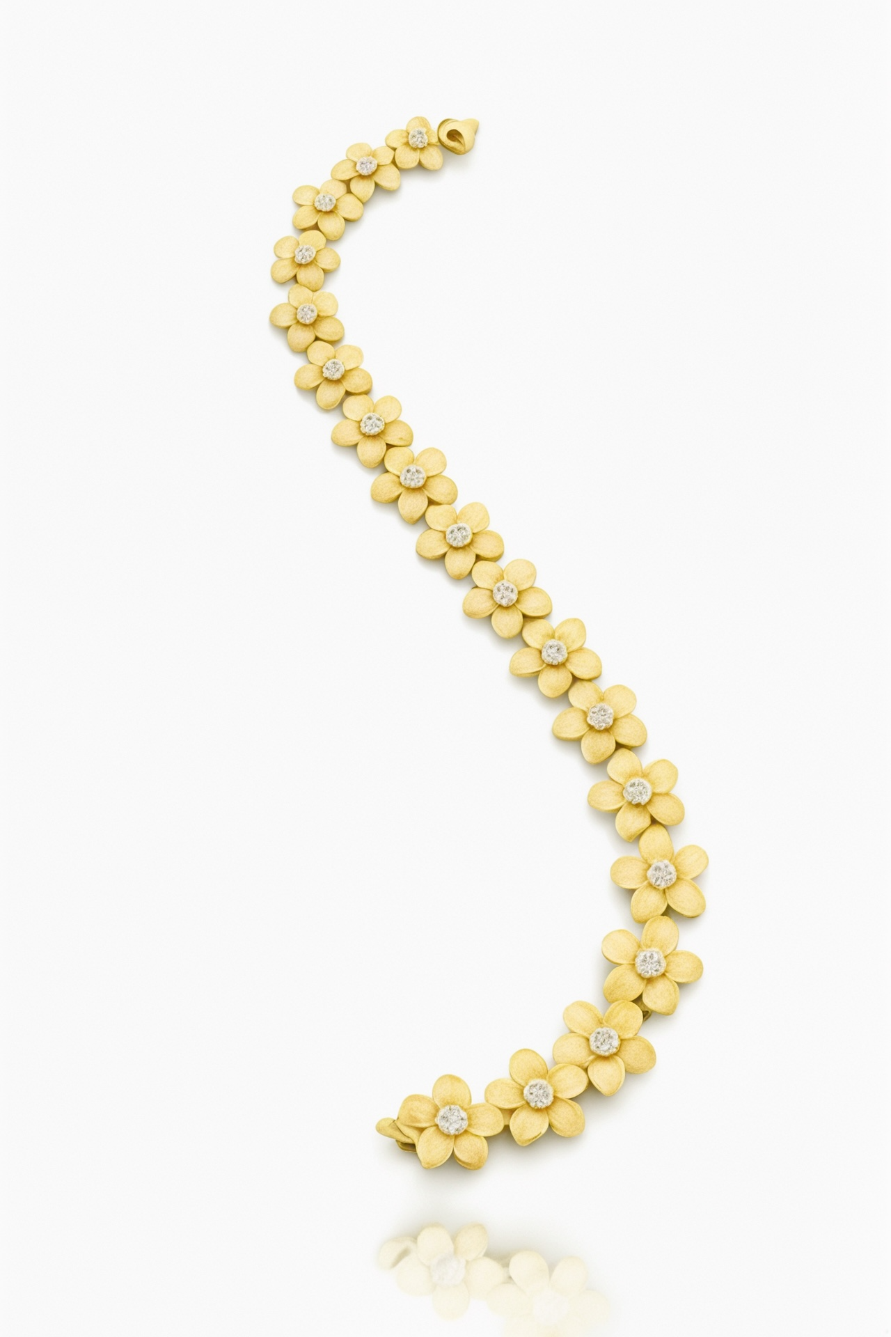 Delicate yet radiant, the Fleur Éternelle Diamond Bracelet is a celebration of timeless femininity and refined craftsmanship. Handcrafted in luminous yellow gold, each floral link is sculpted with softly textured satin-finish petals, creating a velvety glow that contrasts beautifully against the brilliance of its diamond centers.