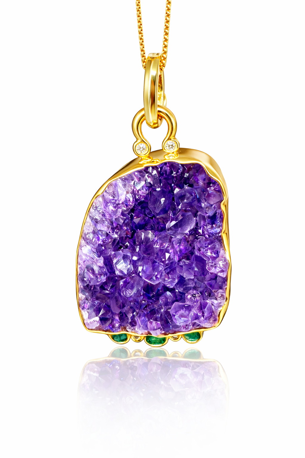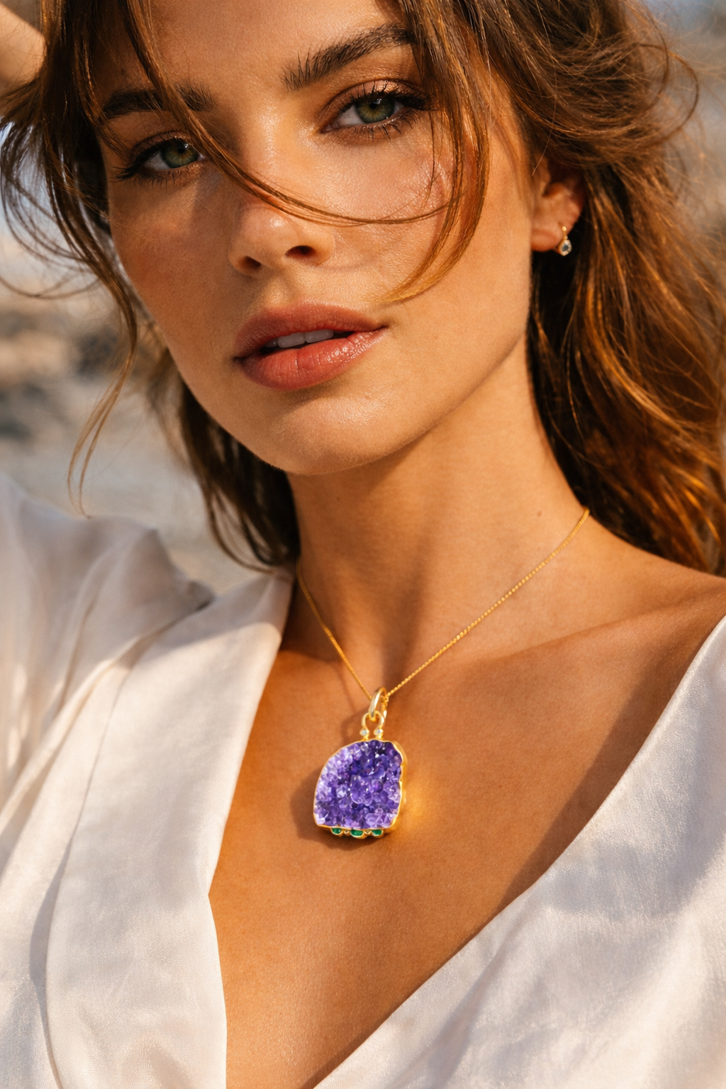 A captivating expression of natural artistry, the Imperial Amethyst Aura Pendant is where raw beauty meets refined luxury. At its heart lies a mesmerizing amethyst geode, its rich violet crystals shimmering with depth and organic brilliance—each facet uniquely formed by nature over time.