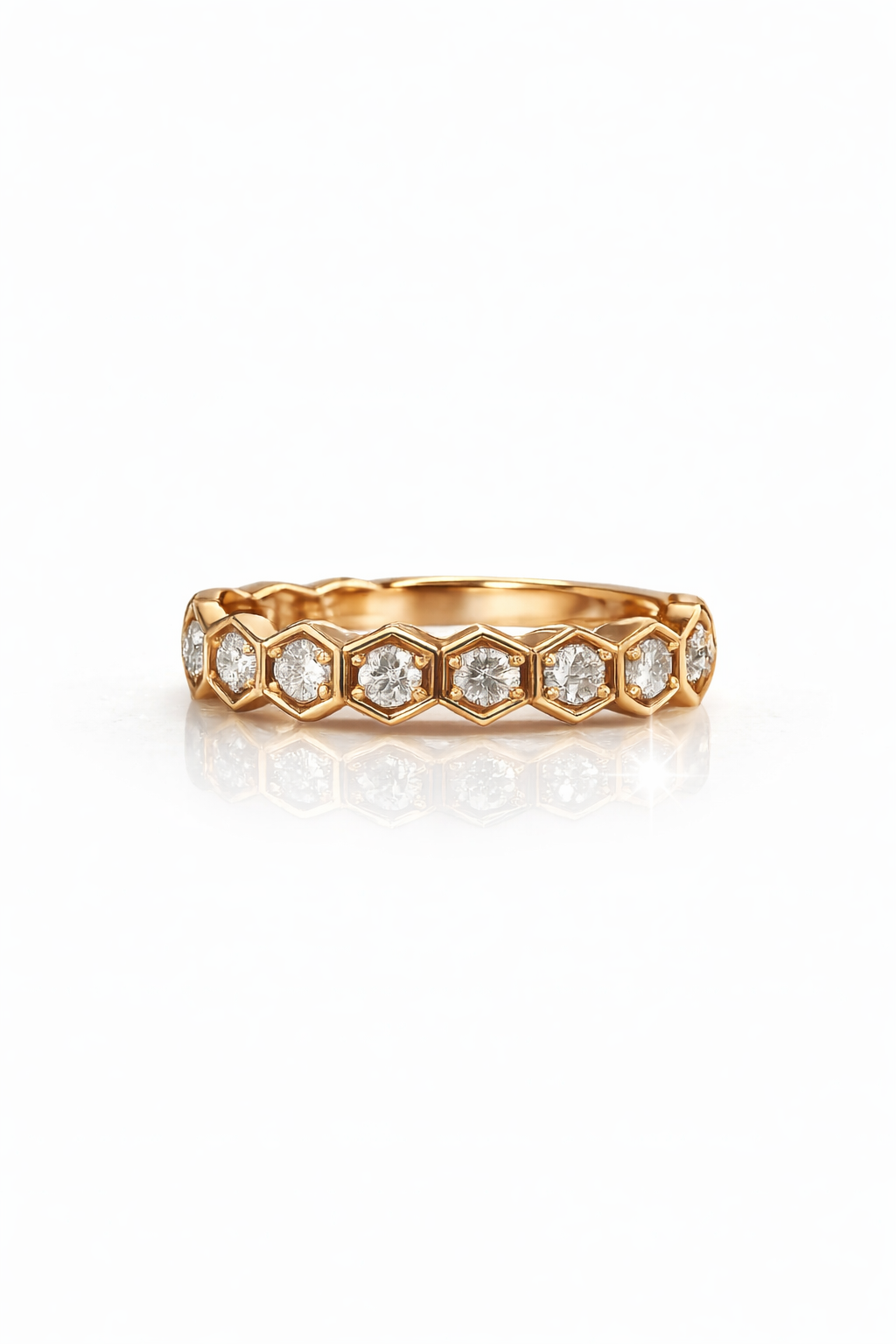 Delicate yet striking, the Roselle Hexa Diamond Band is a modern expression of timeless romance. Crafted in luminous rose gold, this women’s wedding band features a continuous row of brilliant-cut diamonds, each elegantly framed in intricate hexagonal settings—creating a distinctive silhouette that captures light from every angle.