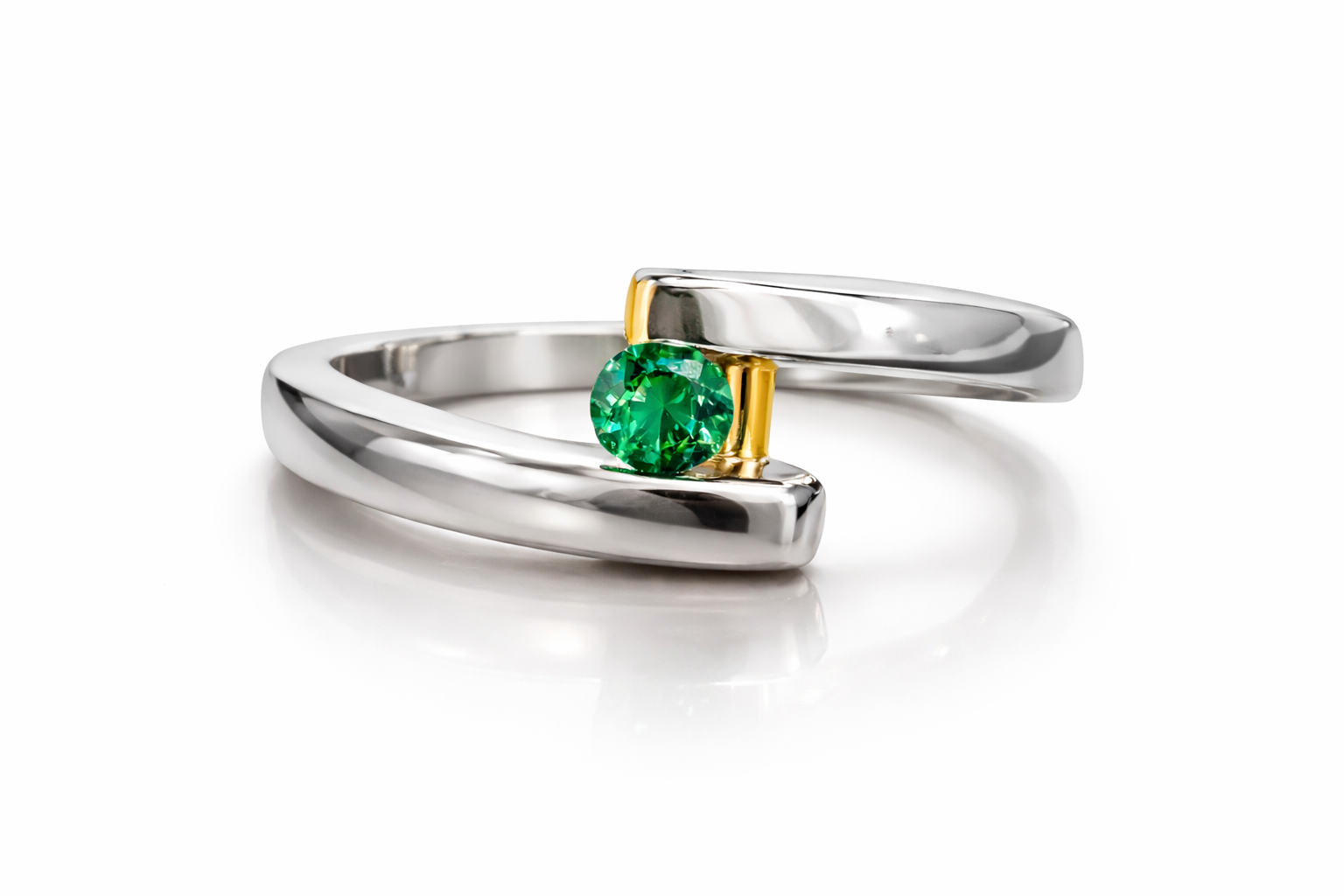 The Verdant Élan Emerald Ring is a striking expression of contemporary elegance. A vivid round-cut green emerald is suspended between fluid curves of high-polish white gold, accented by a refined yellow gold vertical bar that frames the gemstone with architectural precision. The contrast of metals enhances the emerald’s intense, saturated green — creating a bold yet timeless statement.
